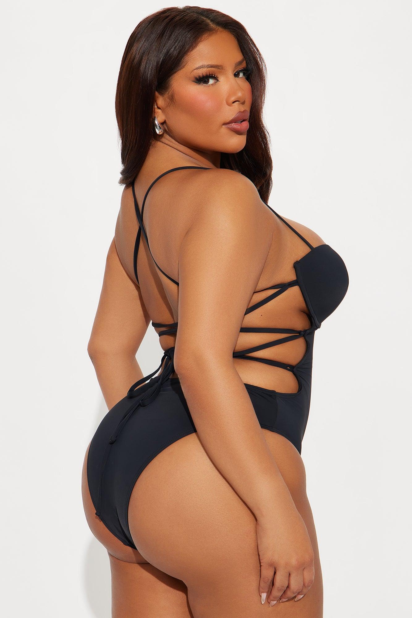 Available In Black. 1 Piece Swimsuit Bra Cup Key Hole Cheeky Lace Up Back Detail Adjustable Back Ties Full Stretch Final Sale Shell : 82% Nylon, 18% Spandex Lining: 90% Polyester 10% Spandex Imported