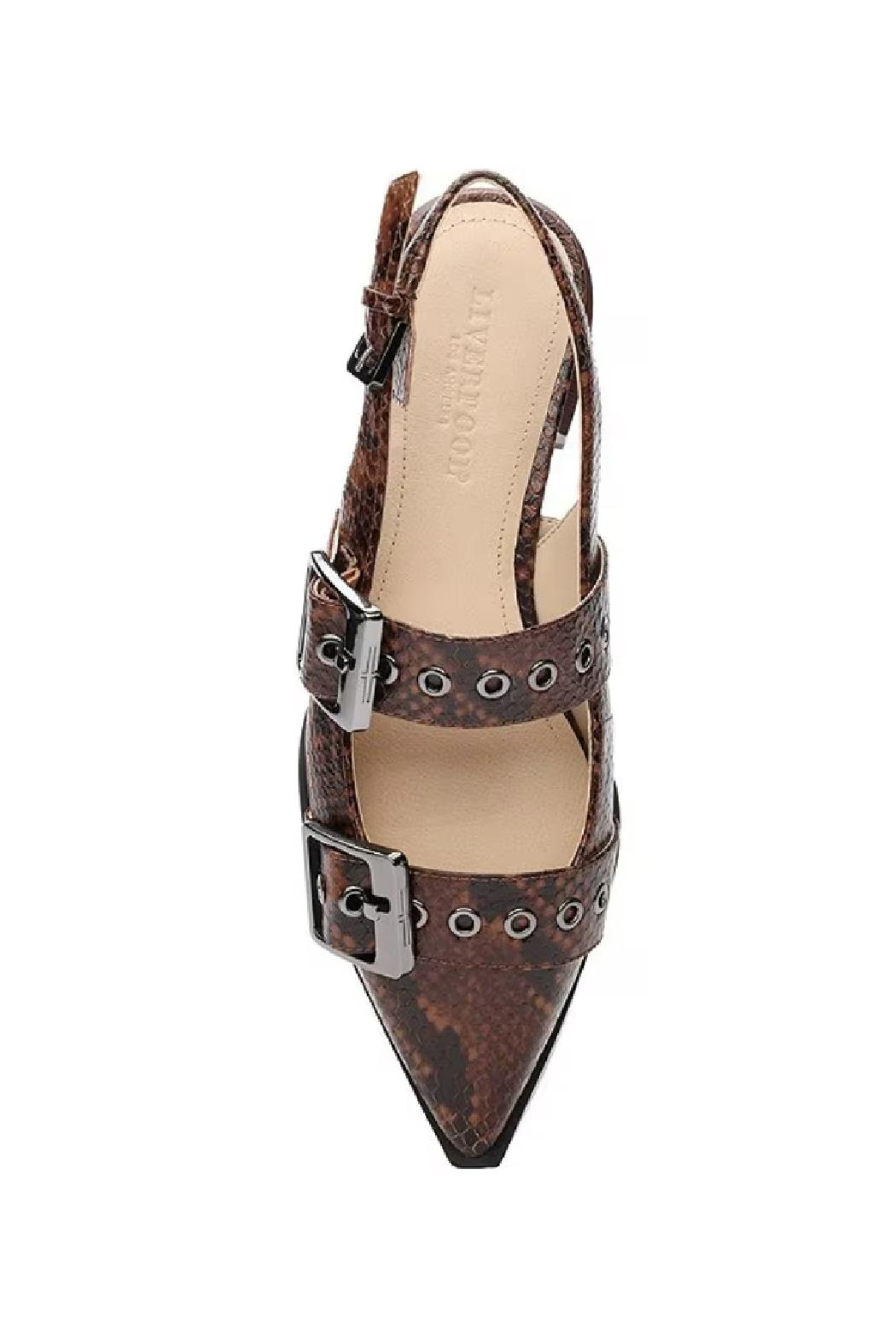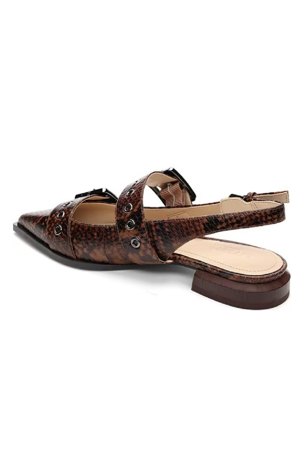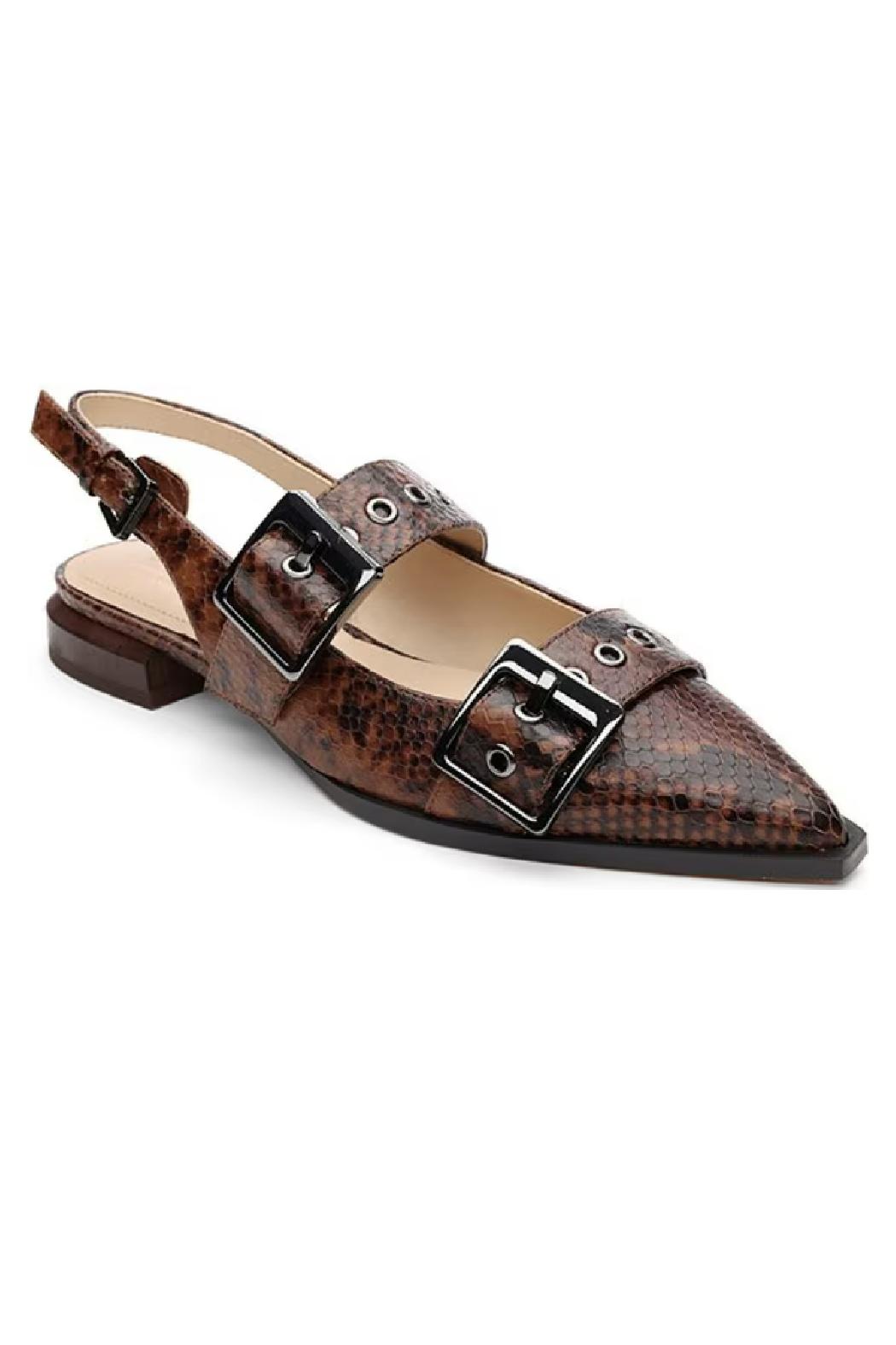 The Villa Snake Embossed Leather Oversized Buckle Slingback Flats by From Liverpool Los Angeles are a sophisticated blend of style and comfort. Crafted with a striking snake-embossed leather upper, these flats exude a chic, textured appeal. The design features a convenient slingback with an oversized buckle closure, ensuring a secure and adjustable fit. Complemented by a synthetic lining and outsole, these flats offer durability and ease of wear. With an approximate 0.75" heel height, they provide just the right lift for all-day comfort. Imported and meticulously crafted, they are a perfect addition to any wardrobe.