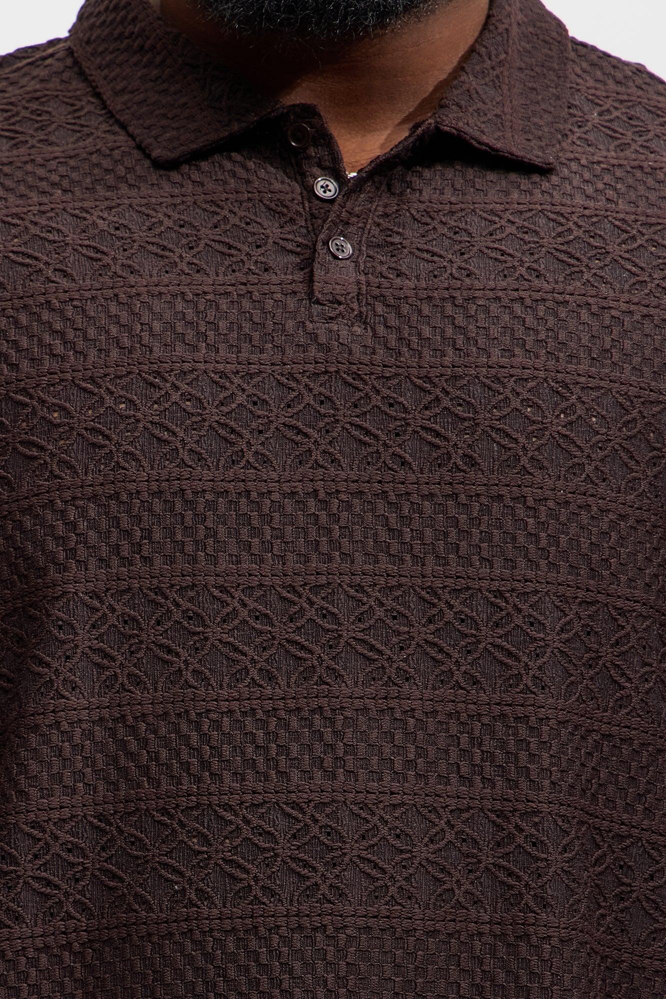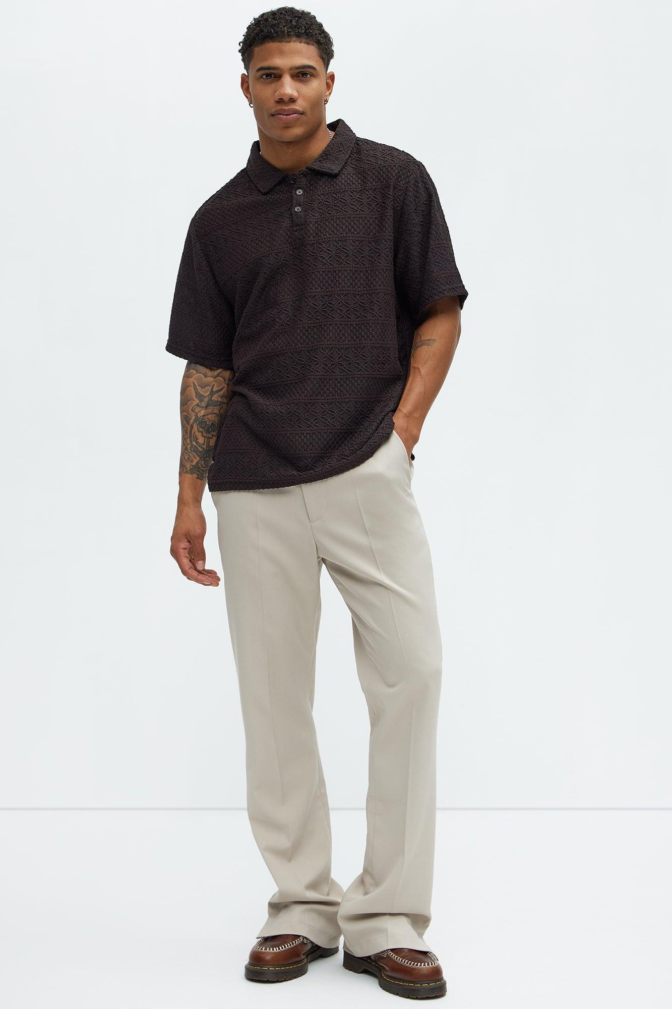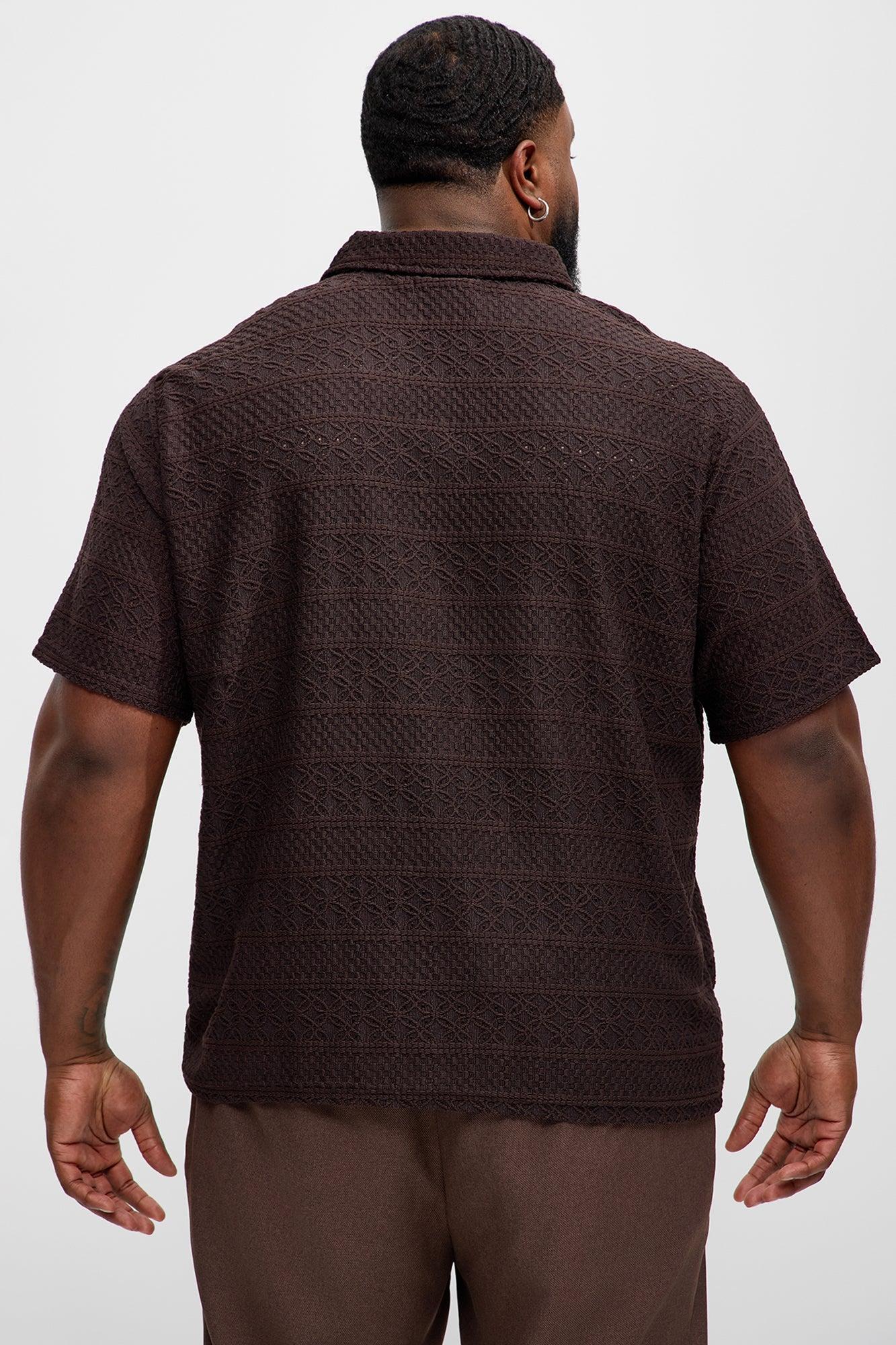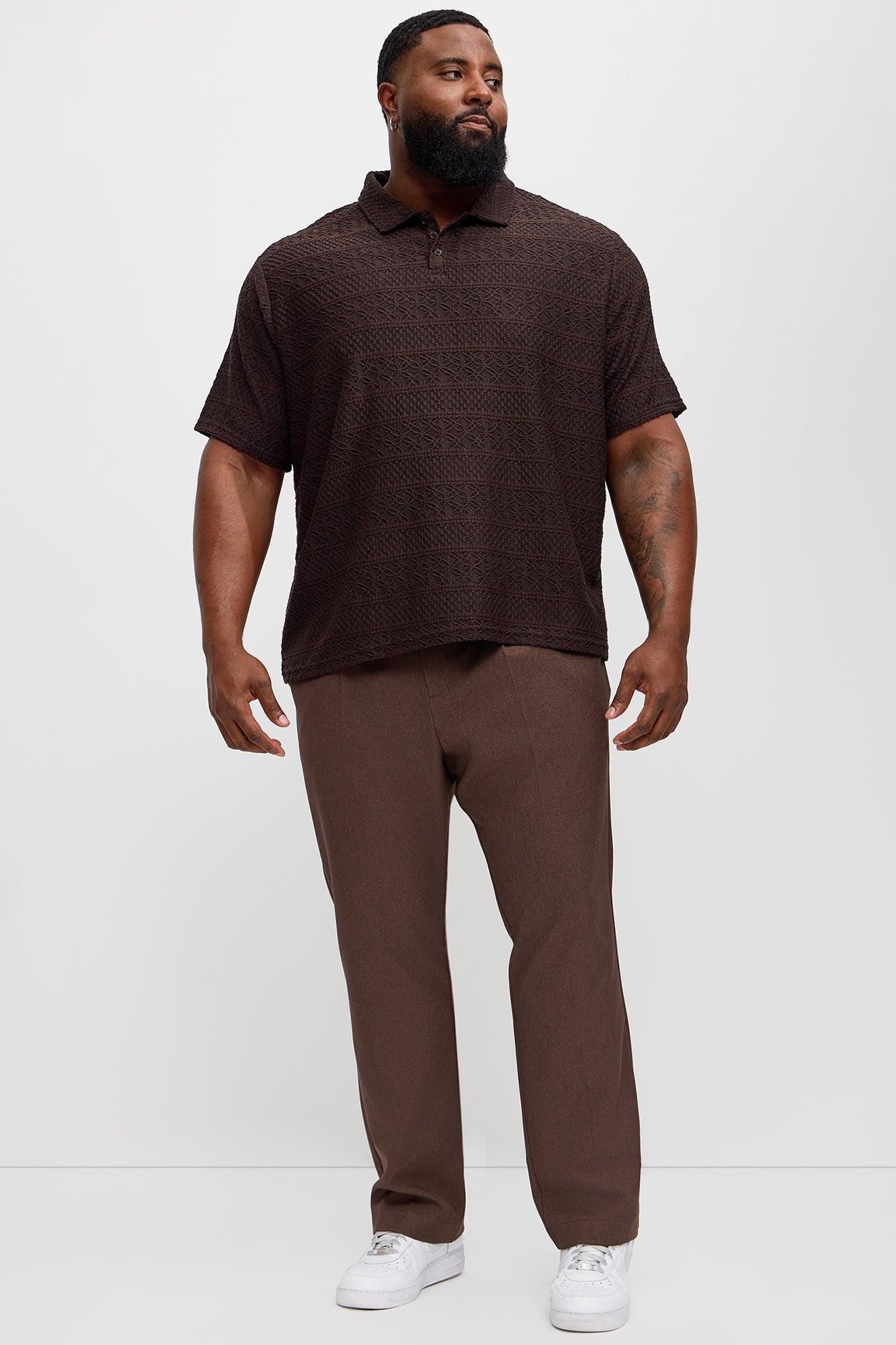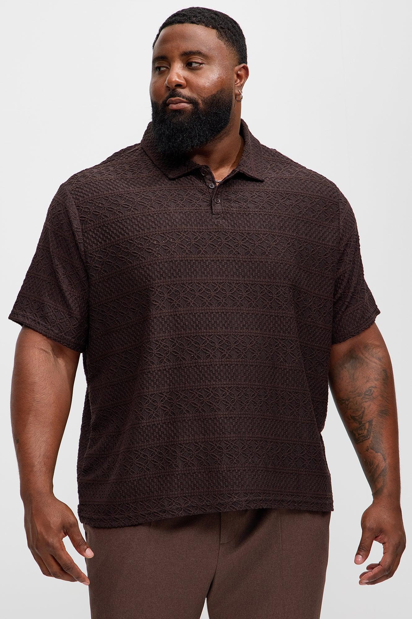 Available In Brown. Johnny Collar Short Sleeve Textured 98% Polyester, 2% Spandex Disclaimer: This garment has been made with delicate materials and may snag or pull if jewelry or watches are worn. Do not wash with items that may cause snagging such as zippers or hooks. This garment is unique and must be handled with care. Imported California Proposition 65 WARNING: Cancer and Reproductive Harm - www.P65Warnings.ca.gov.