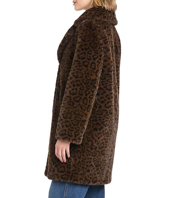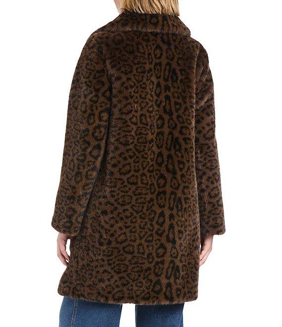From Vince Camuto, this coat features: Faux fur fabrication Leopard print Dramatic notch collar neckline Long sleeves Front slash pockets Heavyweight Straight fit Fully lined Straight hemline Hook and eye closure Approx. 35.5" length Polyester; lining: polyester Dry clean Imported.