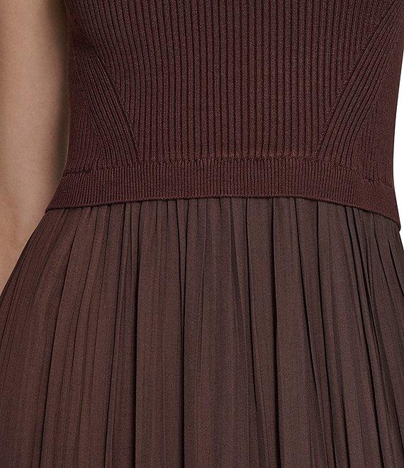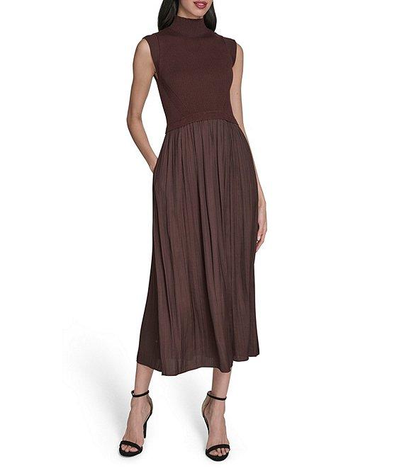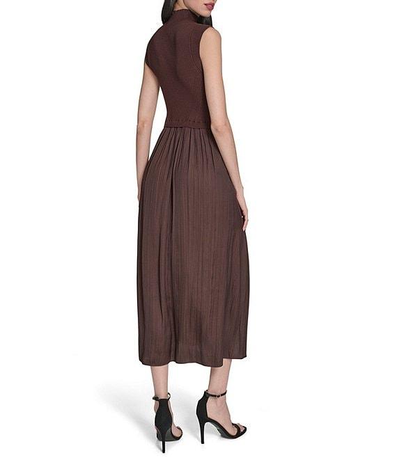 From Vince Camuto, this dress features: Mixed media fabrication Bodice sweater knit fabrication Dress skirt satin fabrication Ribbed mock neckline Cap shoulder Sleeveless Fitted bodice Pullover construction Drop waist Trapeze pleated dress skirt A-line silhouette Ruffle flounce hemline Midi length Approx. 48" length Rayon, polyester Gently hand wash, hang on line to dry Imported.