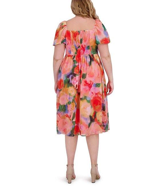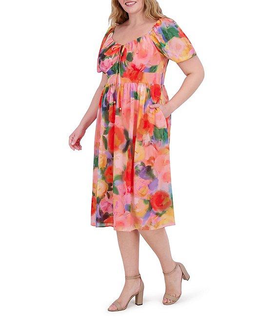 From Vince Camuto Plus, this dress features: Chiffon fabrication Floral print V-neckline Short puff sleeves A-line silhouette Side front pockets Midi length Lined Straight hemline Center back zipper closure Approx. 46.5" in length Polyester Hand wash Imported.