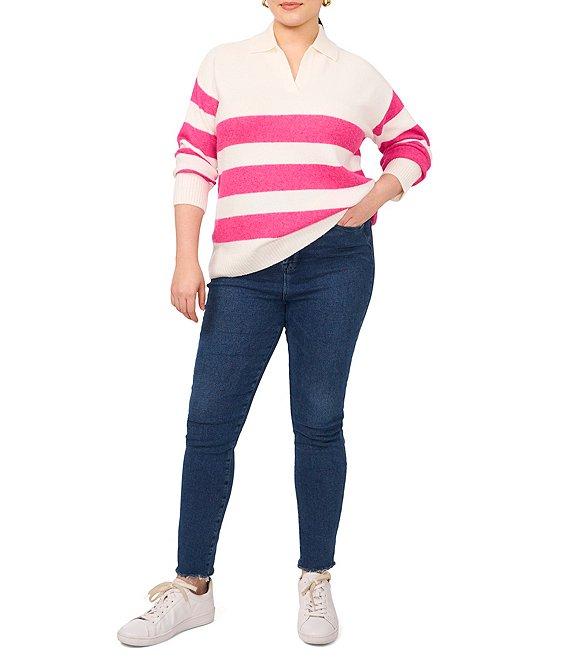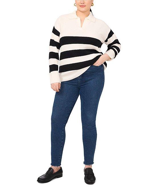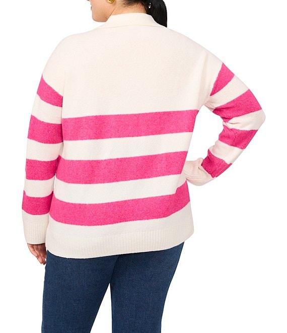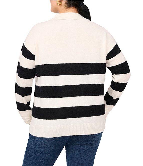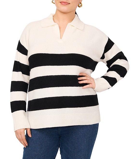 From Vince Camuto Plus, this sweater features: Knit fabrication V-neckline with point collar Long sleeves Stripe print Straight hemline Pullover construction Approx. 28" length Acrylic/polyester/spandex Machine wash/line dry Imported.