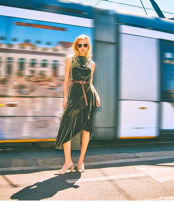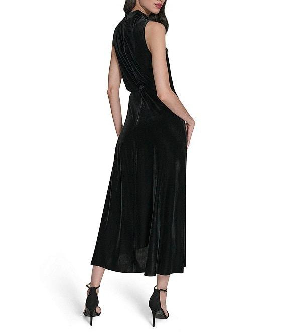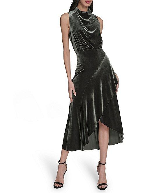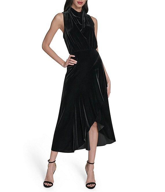 From Vince Camuto, this dress features: Velvet drape fabrication Faux wrap dress skirt silhouette Cowl mock neckline Sleeveless Blouson bodice Fully lined Classic fit Slit opening at hemline Ruffle flounce hemline Midi length Pullover construction Side seam zipper closure Approx. 48" in length Polyester, spandex Gently hand wash separately, promptly remove from wash, hang on line to dry. Imported.