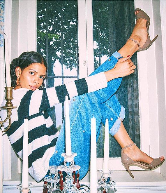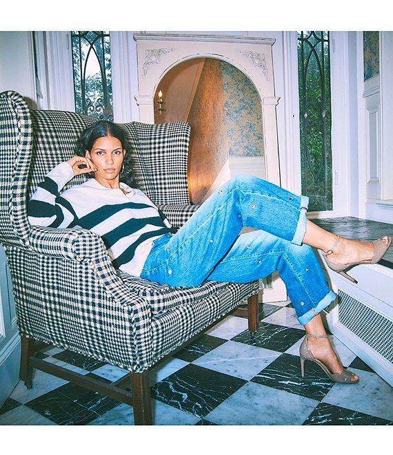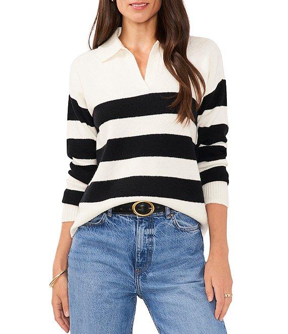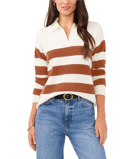 From Vince Camuto, this sweater features: Knit fabrication Point collar neckline Long sleeves Wide striped print 5GG sweater gauge Ribbed cuffs and hemline Pullover construction Approx. 29" in length Acrylic/polyester/spandex Machine wash/line dry Imported.