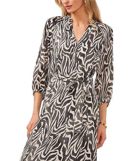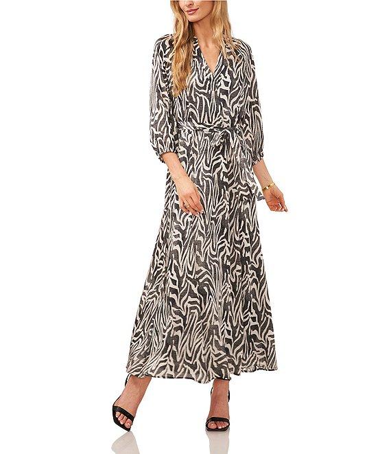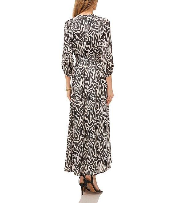 Vince Camuto Wild Zebra Print Satin Yoryu V-Neck 3/4 Sleeve Belted Tie Waist A-Line Maxi Dress