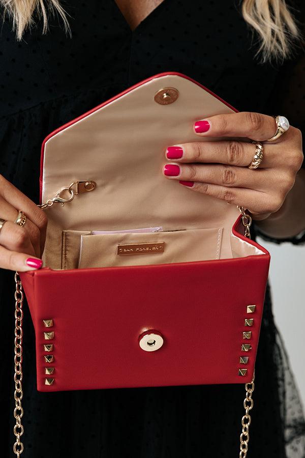 Our chic crimson colored 'Vineyard Bound' purse is sure to be envied with its sleek lightweight material, gold studded detailing, removable chain link shoulder strap, single short handle, envelope closure with a snap button, and spacious square silhouette with an additional inside pocket!