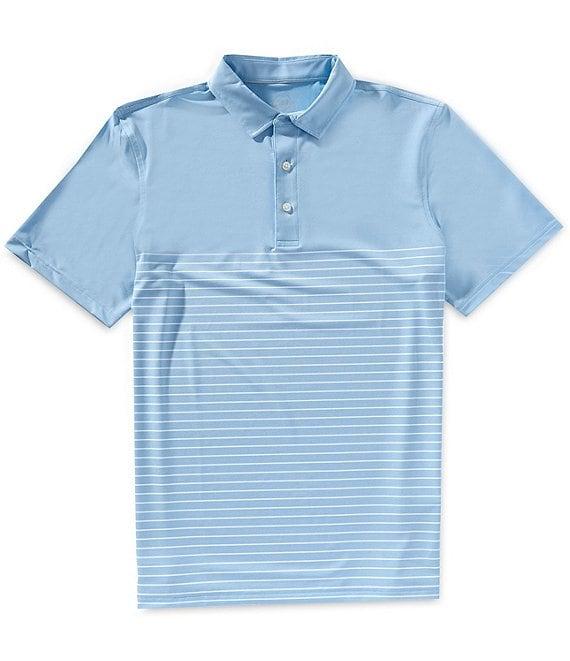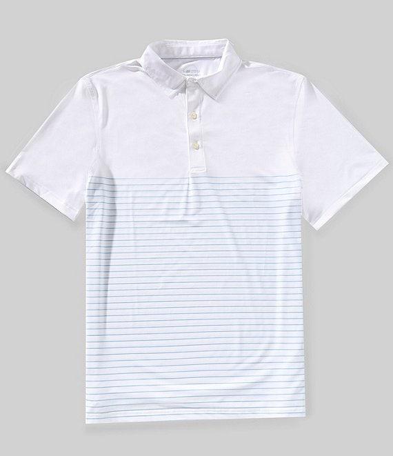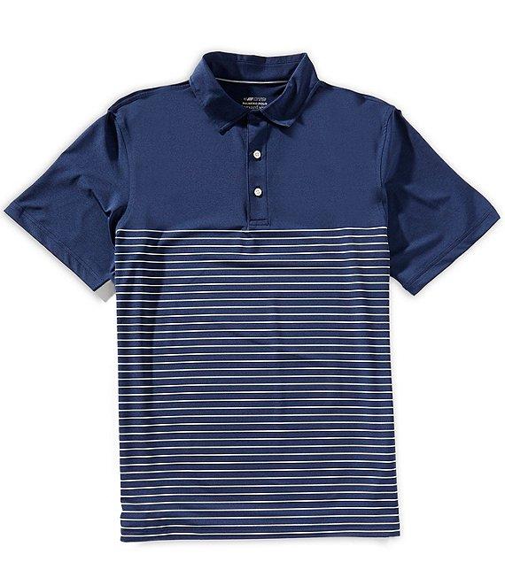 From Vineyard Vines, this shirt features: Solid top with stripe pattern beginning at mid-chest Classic fit Polo collar with reinforced collar stand Detailing on inner collar and back neck 3-button placket Short sleeves Rapid drying UPF 50 sun protection Built-in stretch Polyester/Brrr° polyester/spandex Machine wash Imported.