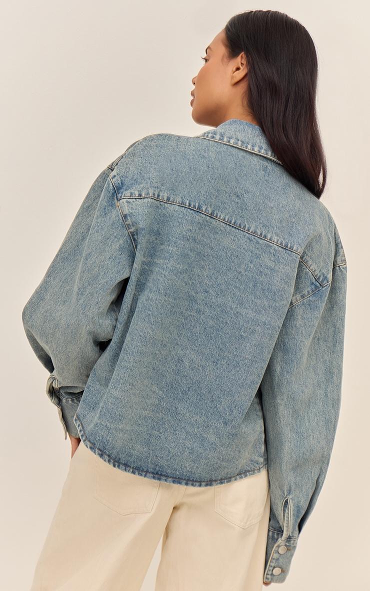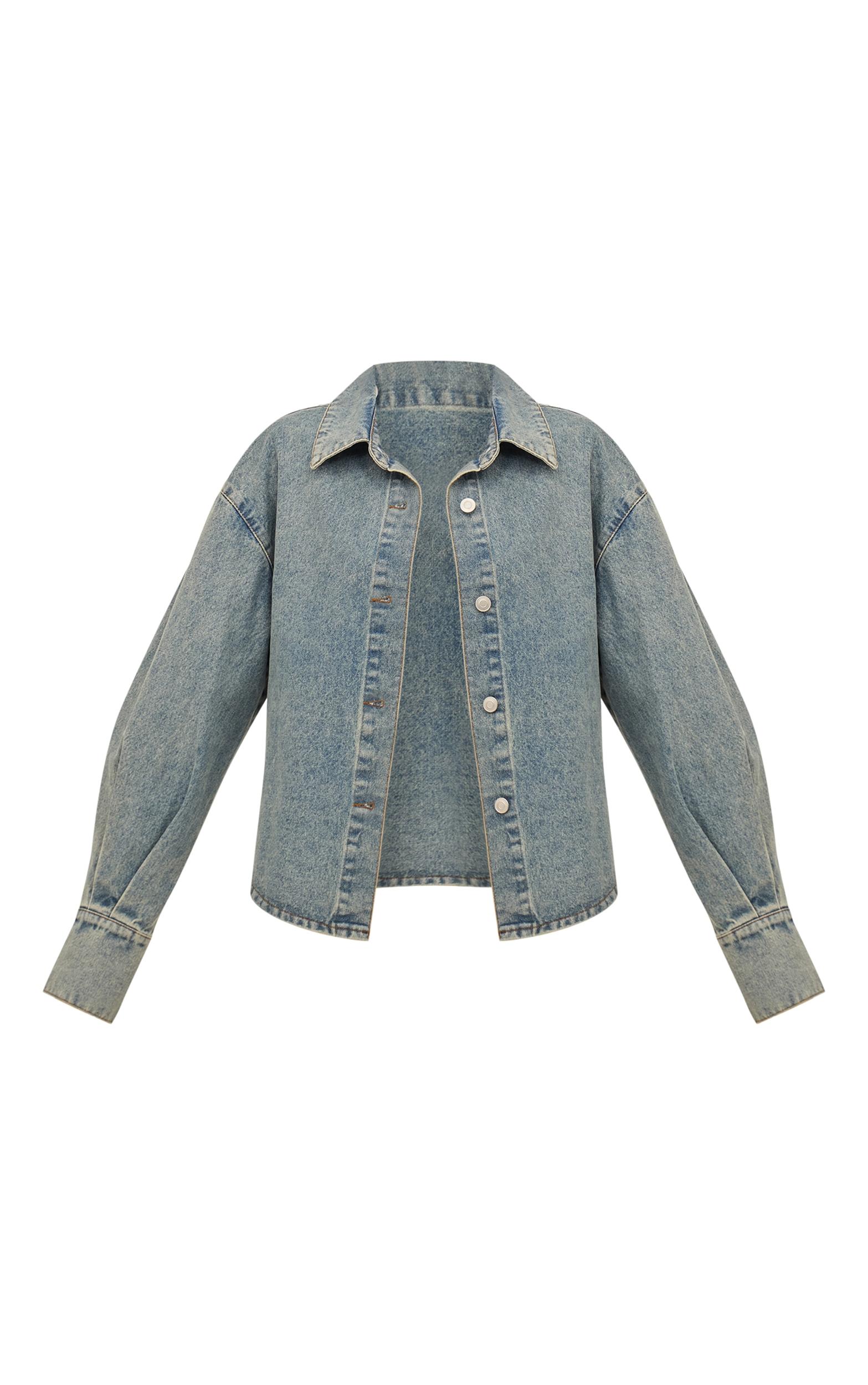 Reimagine your everyday uniform with this vintage balloon sleeve curved hem denim shirt, a standout piece in a versatile vintage wash. It features a classic collar and full button-down placket, framing the distinctive pleated balloon sleeves which taper to wide, three-button cuffs, creating a confident silhouette. A clean curved hem provides a modern finish. Style this essential denim top with tailored black pants for an elevated day look, or wear it open over a fitted Vest with your favorite high-waisted jeans. Finish the aesthetic with some chic block heels and a pair of layered necklaces, curating a look that speaks quiet confidence.Length approx 48.5cm/19inch (Based on sample size US 4)Model wears size UK 8/ EU 36/ AUS 8/ US 4Model Height - 5ft 9inchp]:!mb-4inch>Brand: PrettyLittleThingCategory: DenimProduct type: Denim ShirtColor: Vintage WashMaterial: Rigid DenimNeckline: ShirtSleeves: LongOccasion: Day