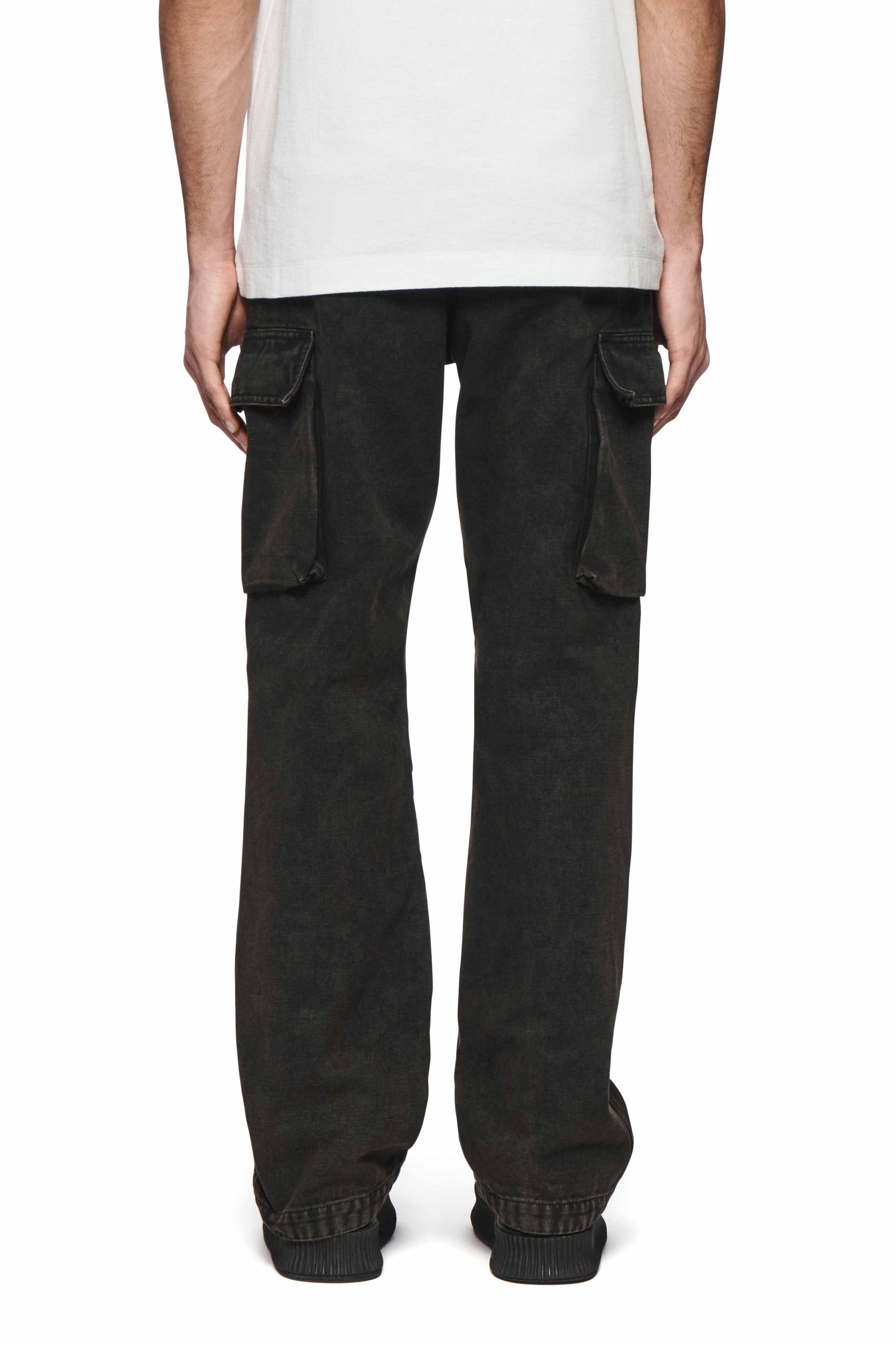 A utilitarian staple, this vintage-inspired black canvas pant is sturdy to endure plenty of wear. The pair features double cargo pockets and straight legs, cut long to break nicely towards the hem. Fall Winter 2024 White Label 100% Cotton 12" Front Rise, 32" Inseam, 15 3/4" Leg Opening Mid Rise Overdyed