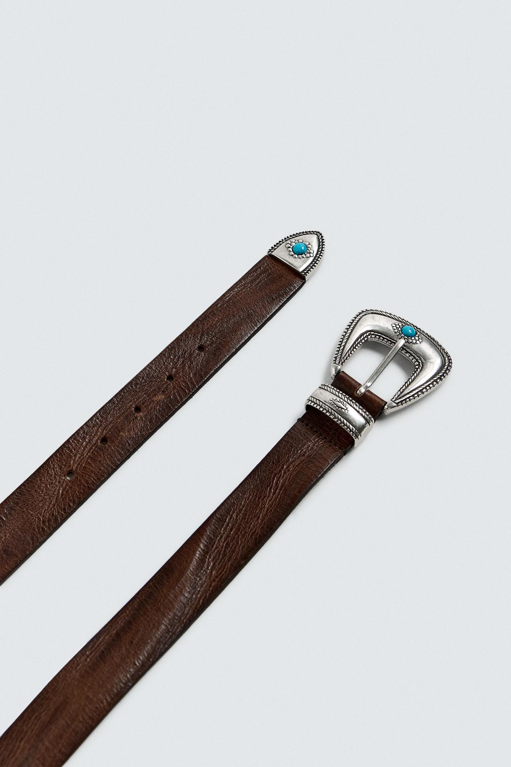 Belt made of leather. Tip finished with a metal piece. Metal buckle and loop closure. Appliqués of contrasting combined beads. Width: 1 1/8 in