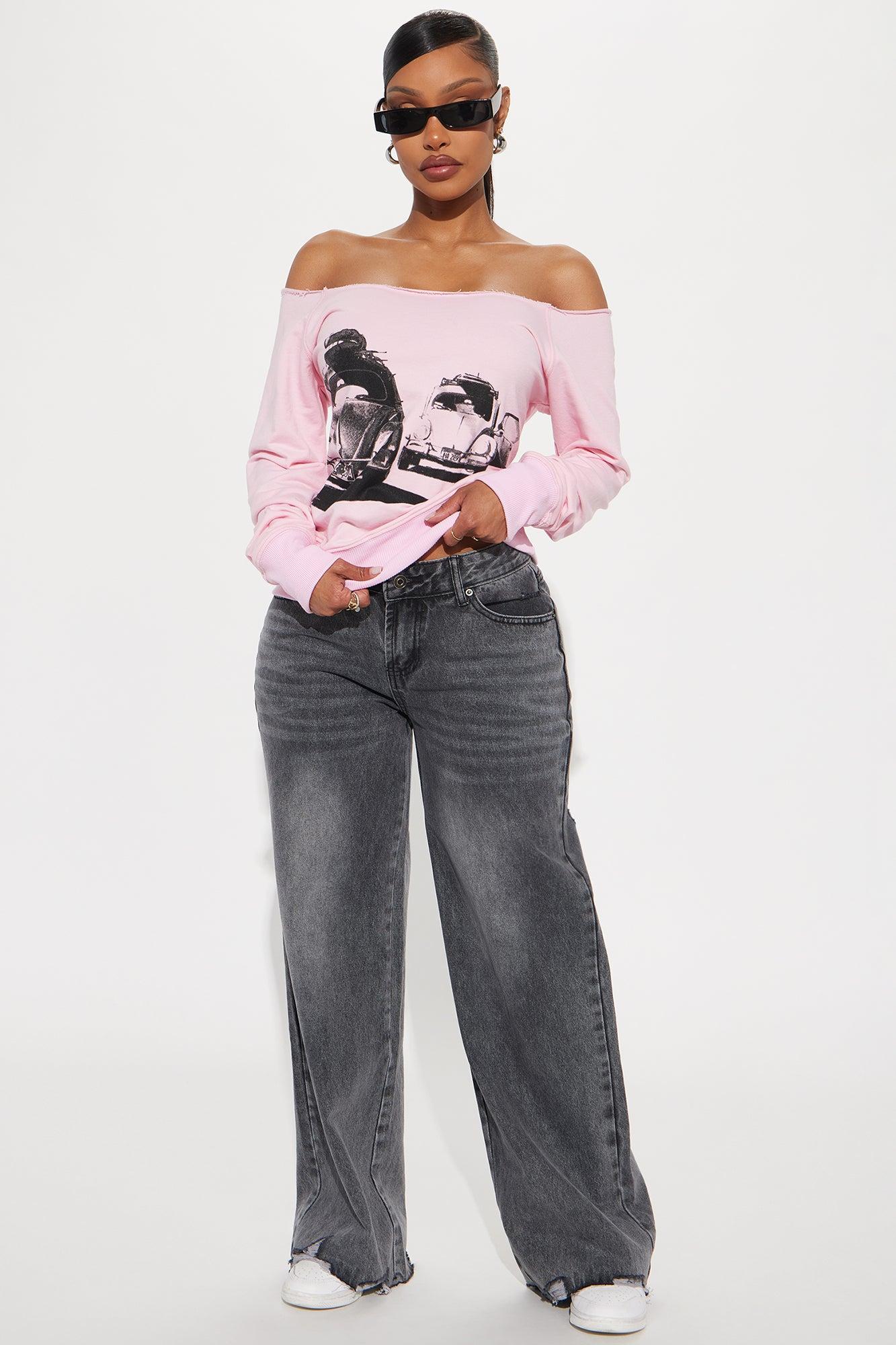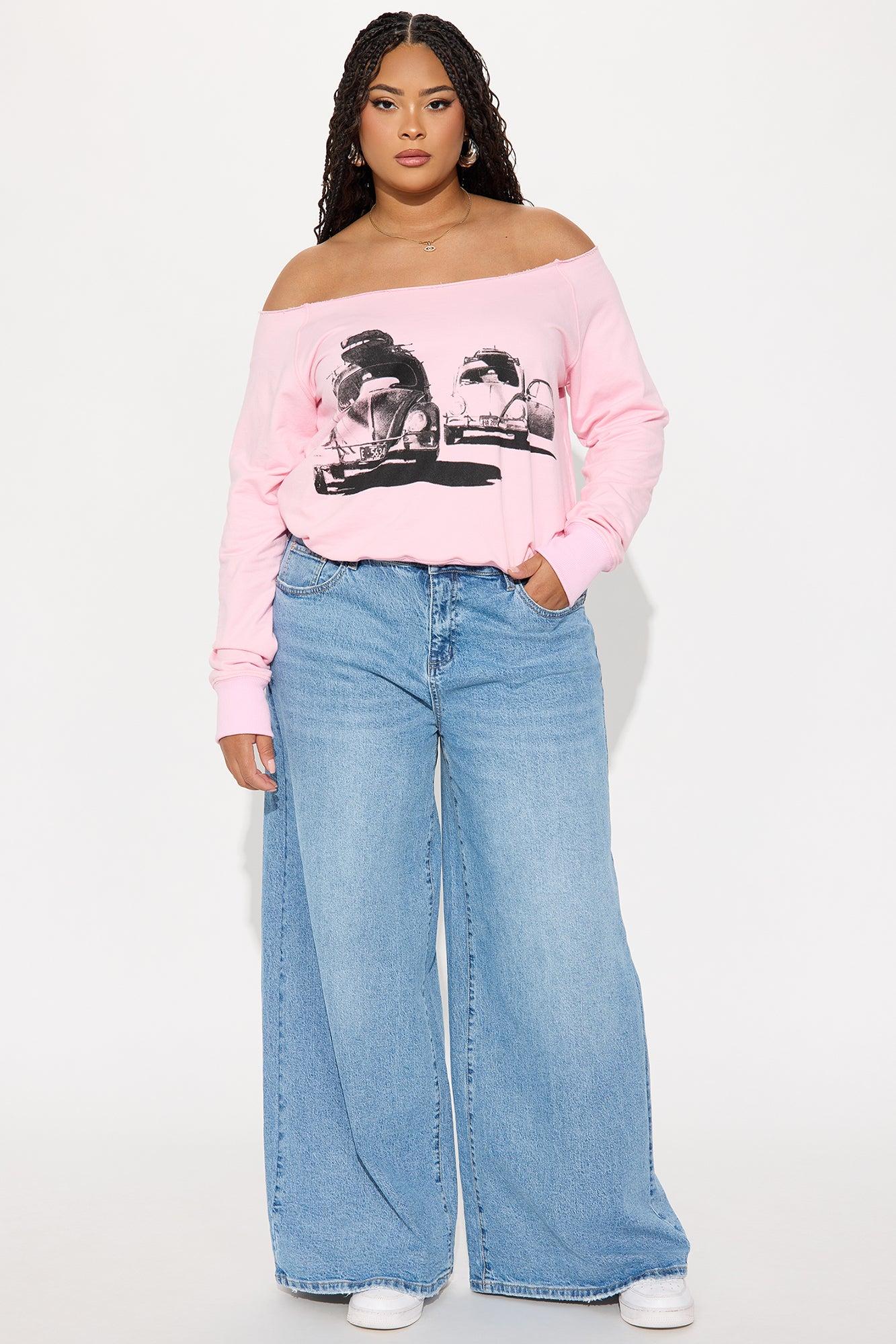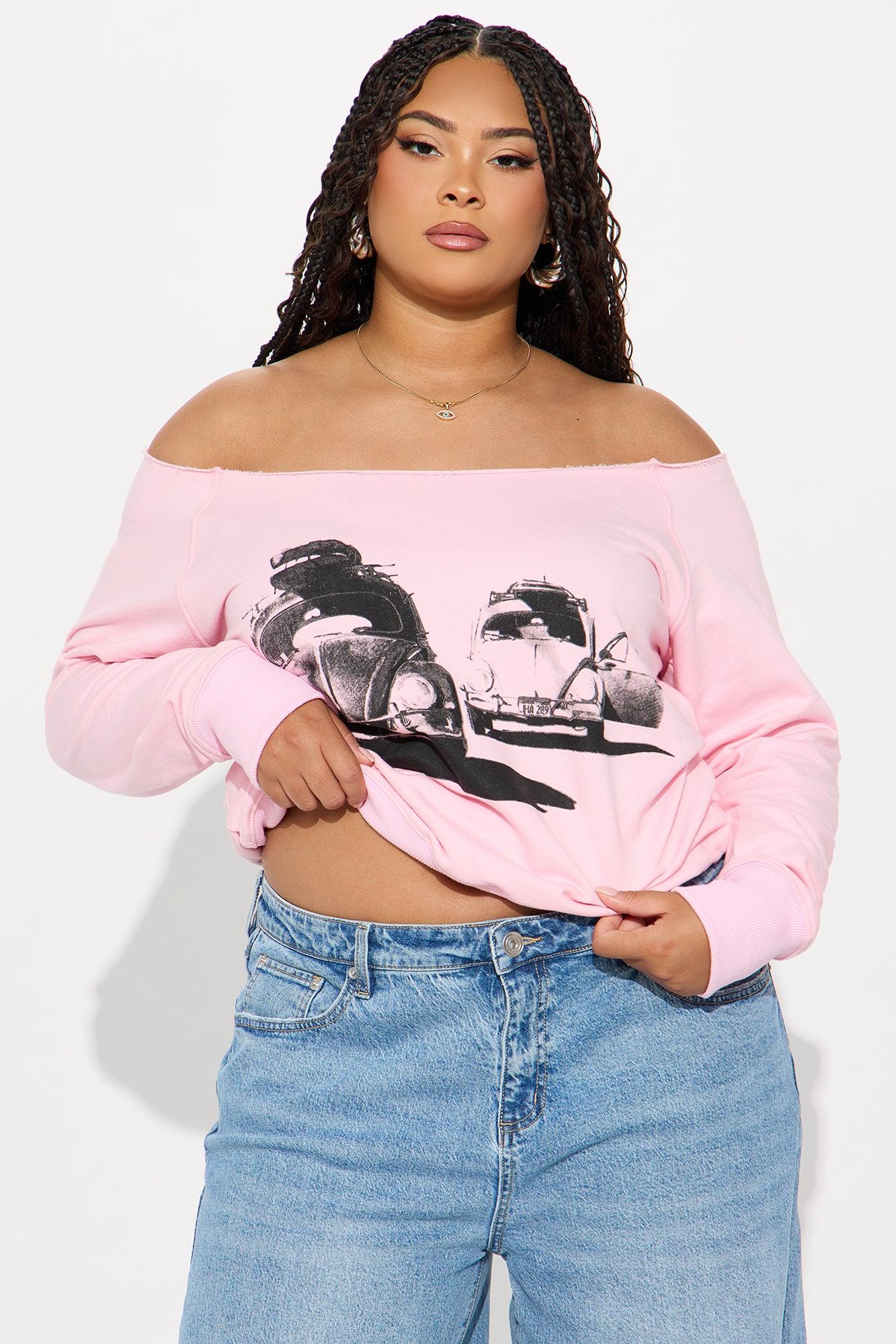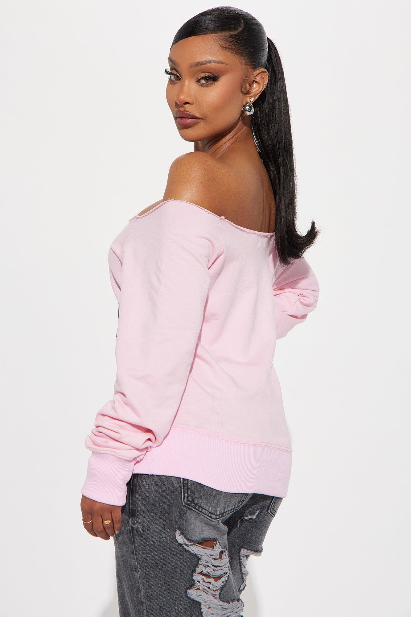 Available In Pink. Off shoulder Long Sleeve Front Screen Stretch Disclaimer: Due To The Printing Process A Difference In Saturation May Occur. Each Garment Is Unique. 50% Cotton 50% Polyester Imported