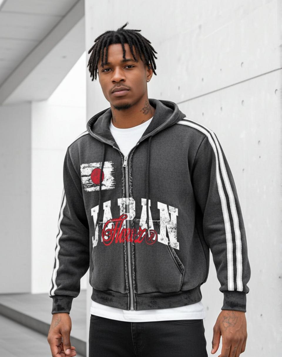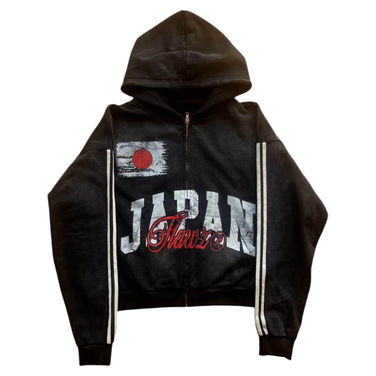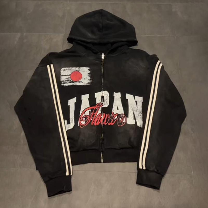 Vintage Japan Street Culture Zip-Up Washed Hoodie. SPU: XH-235549-HWE Fabric: Polyester Fabric Weight: 350g Pattern: Japanese Print Process: Washed Gender: Women,Men Season: Spring,Fall,Winter Size Range: S-XL Color: Black Print Position: Front