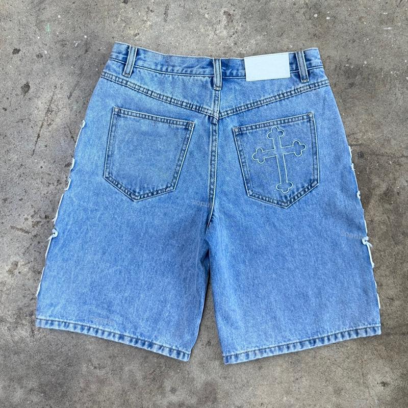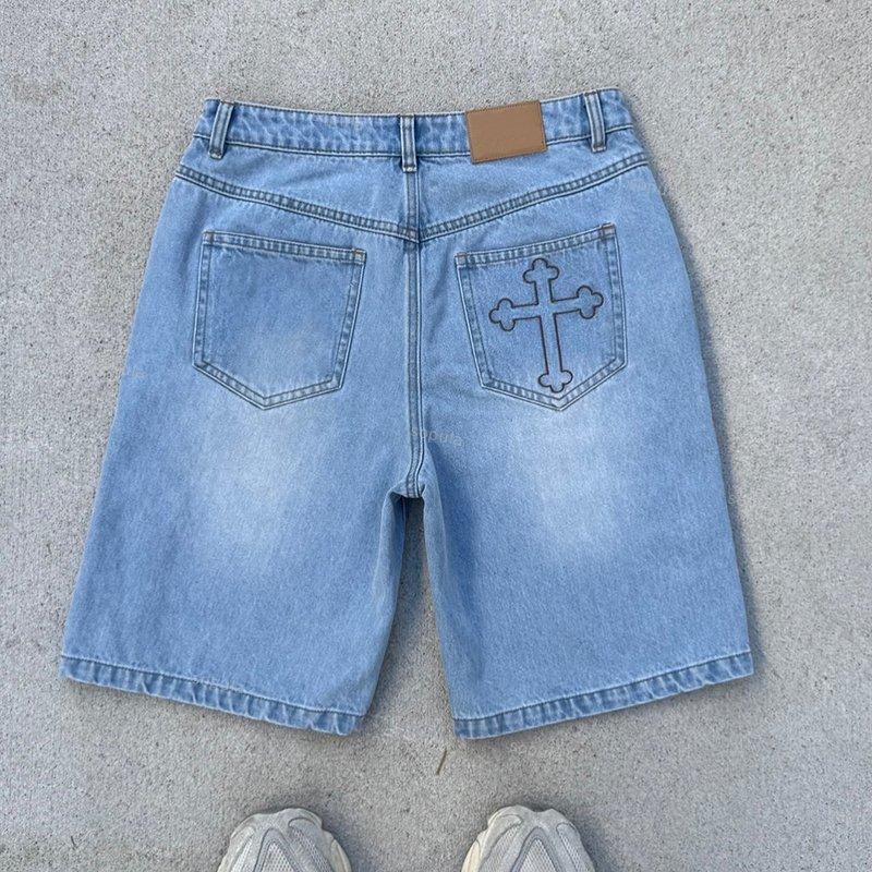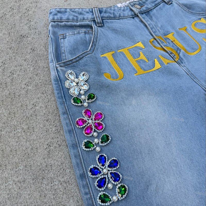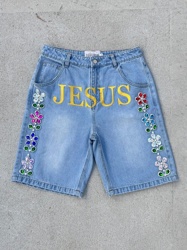 Vintage Jesus Embroidered Hand Crafted Pearls & Stones Denim Shorts