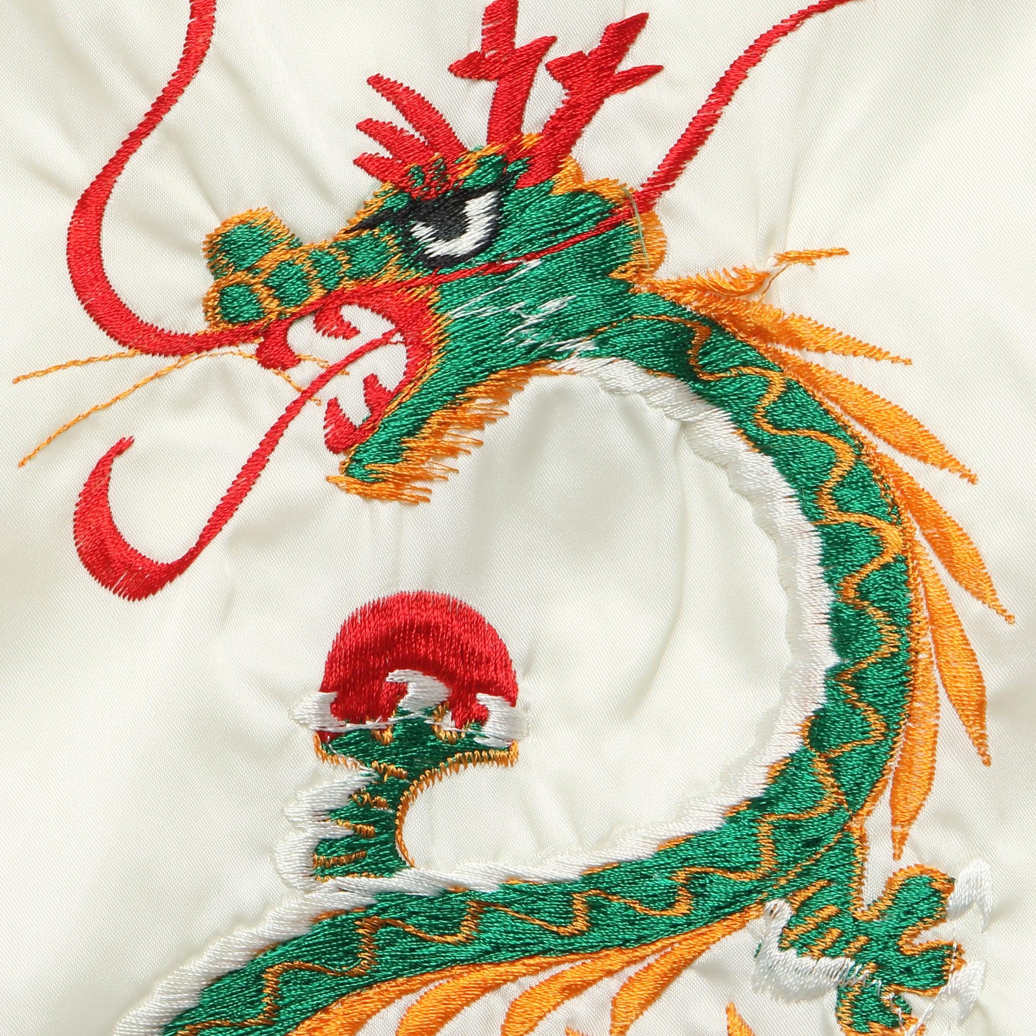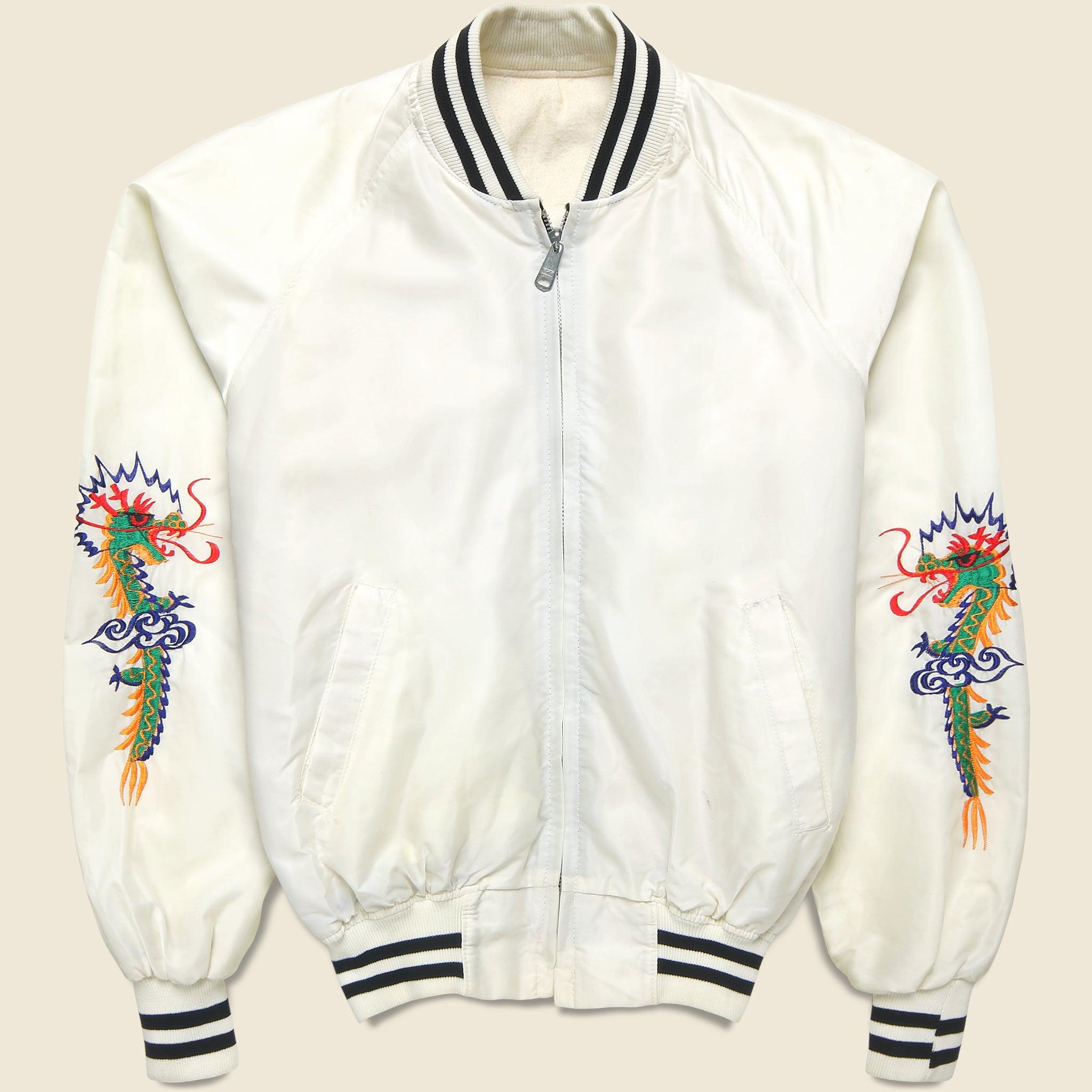 Souvenir Jackets like this one became popular with American G.I.s after the Second World War and eventually became part of the counterculture movement thanks to rock stars like Mick Jagger. This vintage Souvenir Jacket from Korea has all the hallmarks like embroidered dragons on the sleeves and across the back with its country of origin. It has a relaxed fit that fits a Medium-Large best and will make a great addition to any cool-weather wardrobe. Vintage Korean souvenir jacket Embroidered dragon details “Korea” embroidery at the back Ribbed cuffs, hem, & collar Wear consistent with age Measurements: Chest: 46” | Shoulder: 18” | Sleeve: 34” | Length: 24 ½”