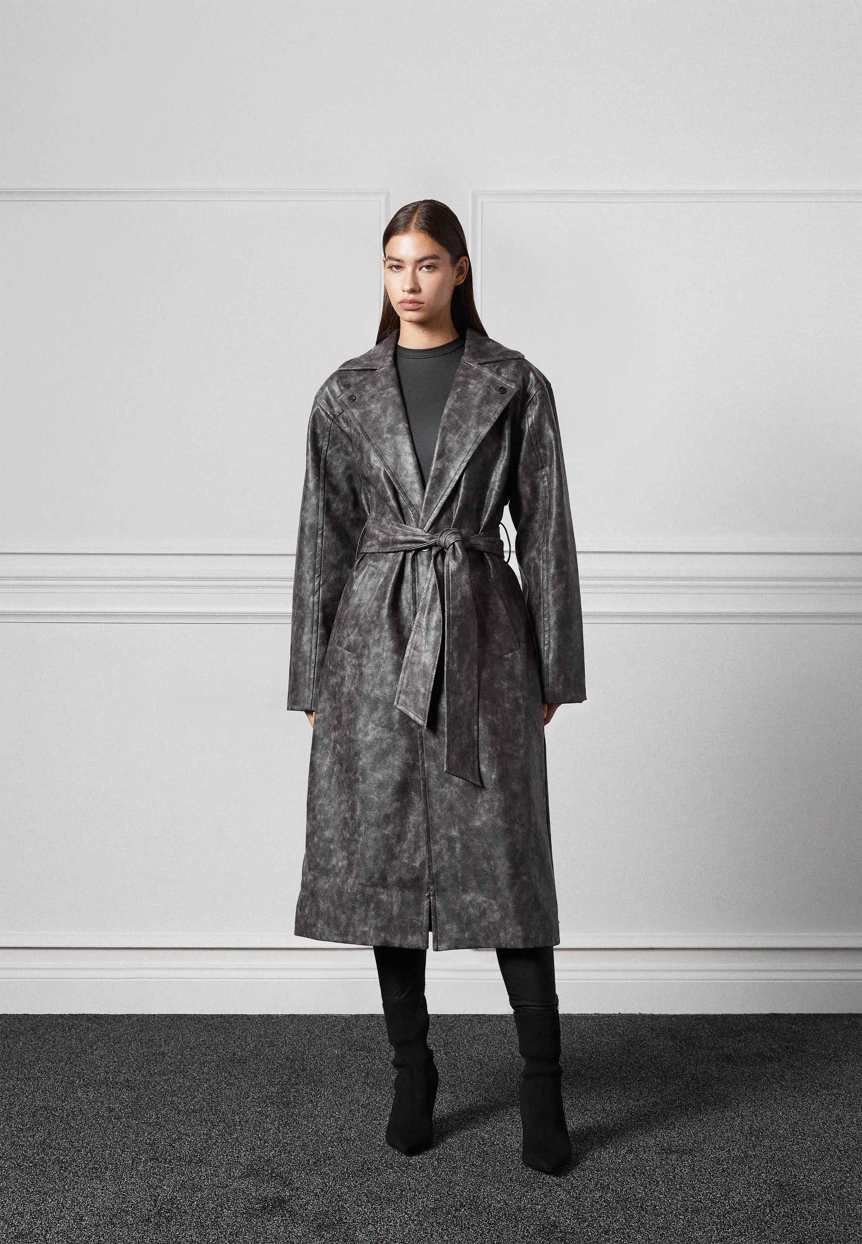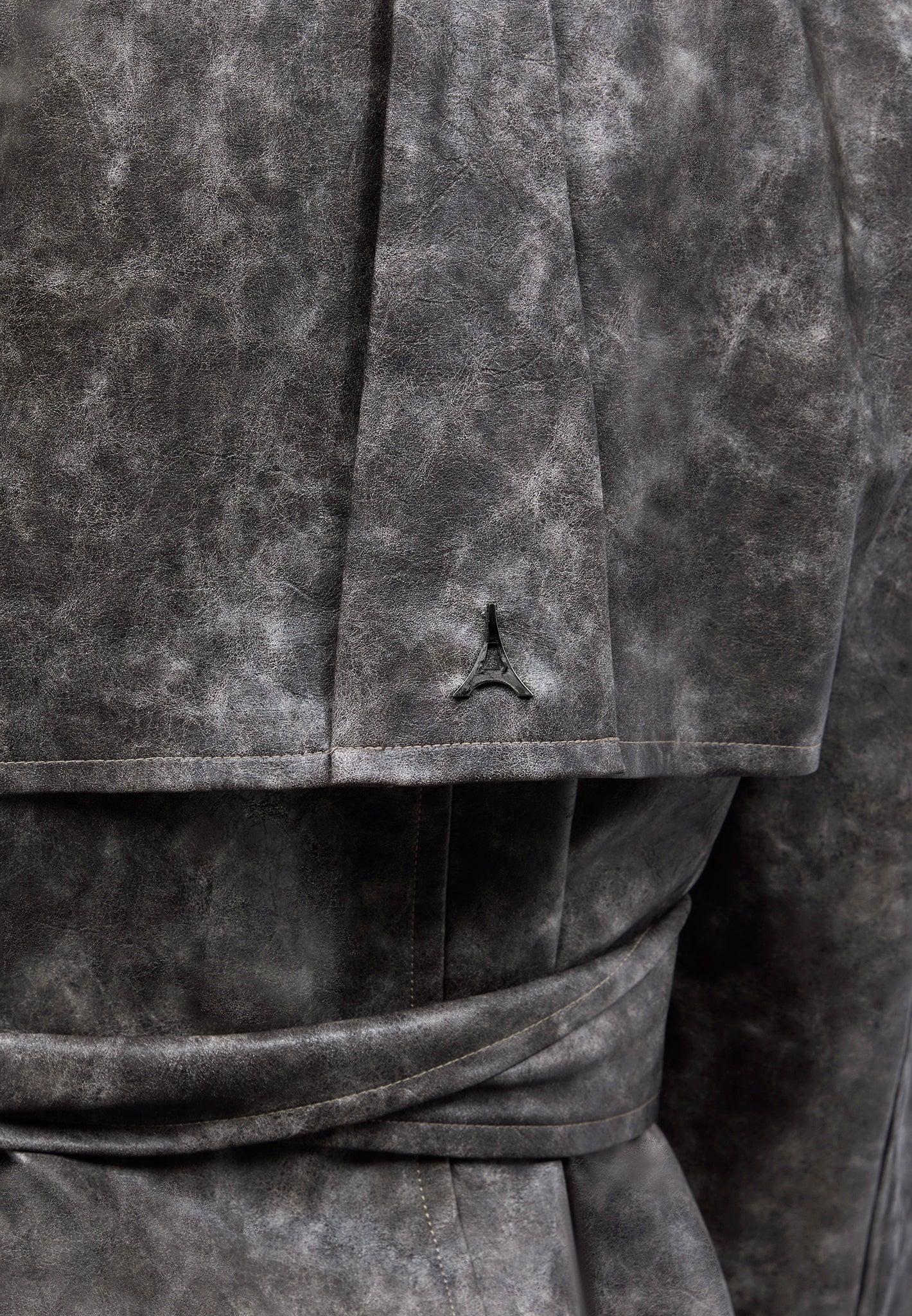 Look stylish in this Vintage Vegan Leather Trench Coat. Cut in a classic design, it boasts a flattering fit that will make you stand out from the crowd. Crafted with vegan leather, this versatile coat is perfect for every chilly day! Trench Coat Silhouette Classic Lapel Collar Belt Feature Welt Pockets Storm Flap Feature MDV Eiffel Poppers Gunmetal Manière De Voir Eiffel Plaque