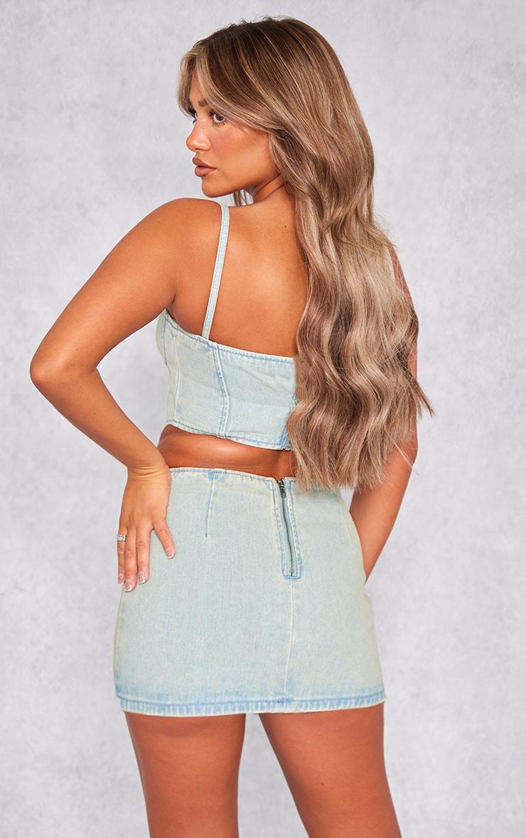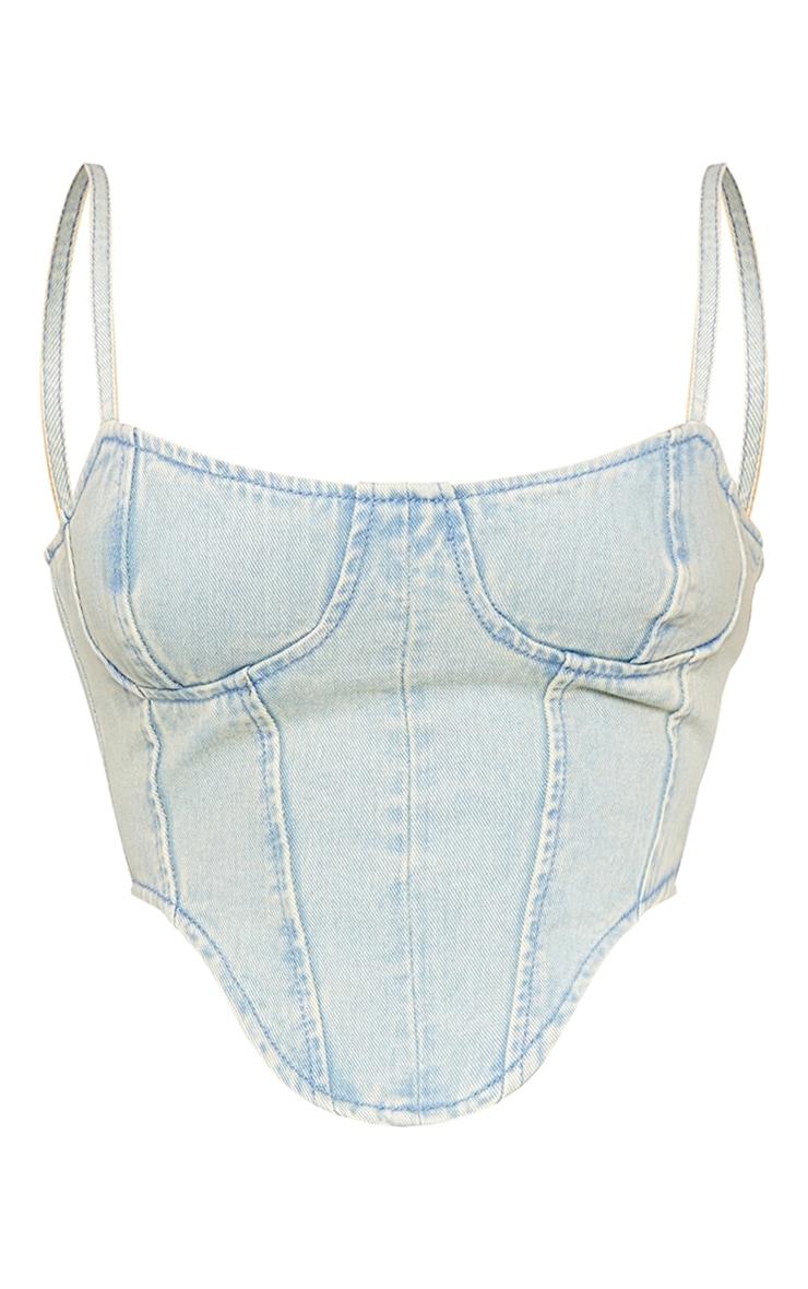 Level up your wardrobe this season with this vintage light blue wash dipped hem denim corset. Whether you have plans or someone special this weekend, this corset is sure to tick all the boxes. With a vintage light blue wash denim material, a dipped hem and a square neckline, how could you say no? Why not shop the look and team with the matching mini skirt, a faux leather jacket, and knee-high boots for a flawless finish. Length approx 38cm/15inch (Based on a sample size UK 8) Model wears size UK 8/ EU 36/ AUS 8/ US 4Model Height - 5ft 7inchp]:!mb-4inch>Category: DenimProduct type: Denim CorsetColor: Vintage Light WashMaterial: Rigid DenimDesign: PlainOccasion: Day