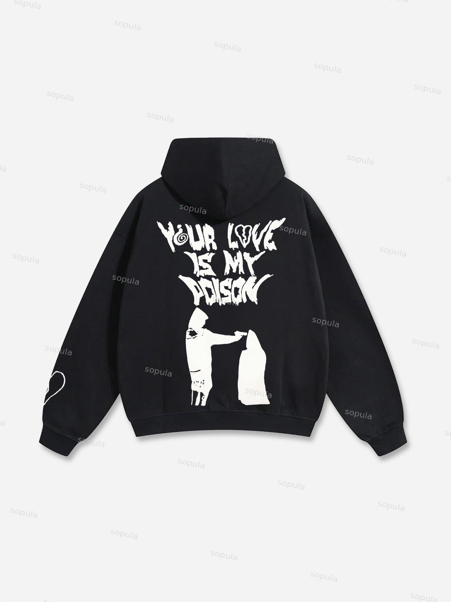 Vintage Love Is Poison Graphic Oversized Hoodie. SPU: CP-107087-LSX Fabric Name: 100% Cotton Pattern: Letter Print Process: Printed Style: Vintage Length: Regular Collar: Hoodie Collar Popular Elements: Oversized Sleeve Type: Long Sleeve Occasion: Street Theme: Spring, Fall Size Shoulder Bust Length Sleeve Height (Reco) Weight (Reco) cm inch cm inch cm inch cm inch in cm lb kg M 60 23.4 115 44.9 68 26.5 56 21.8 5'5"-5'7" 165-170 132-154 60-70 L 61 23.8 120 46.8 70 27.3 58 22.6 5'7"-5'9" 170-175 154-176 70-80 XL 62 24.2 125 48.8 72 28.1 60 23.4 5'9"-5'11" 175-180 176-198 80-90 2XL 63 24.6 130 50.7 74 28.9 62 24.2 5'11"-6'1" 180-185 198-220 90-100 3XL 64 25.0 135 52.7 76 29.6 64 25.0 6'1"-6'3" 185-190 220-242 100-110 Due to manual measurement, there may be an error of 1-3cm