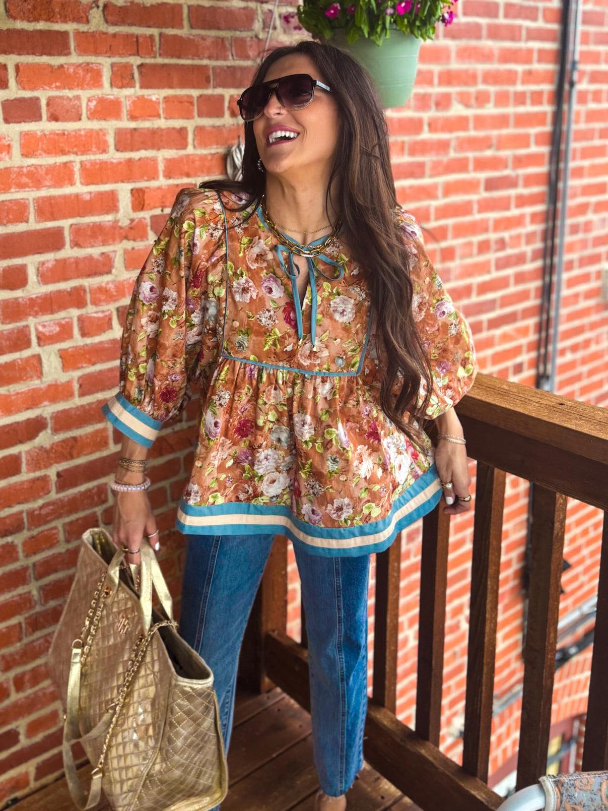 Embrace a playful, vintage vibe with this charming Vintage Meadow Blouse. Its ¾ sleeves and empire waist create a flattering, breezy fit, while the multicolor accent band adds a fun pop of color. Perfect for carefree days and effortless style!