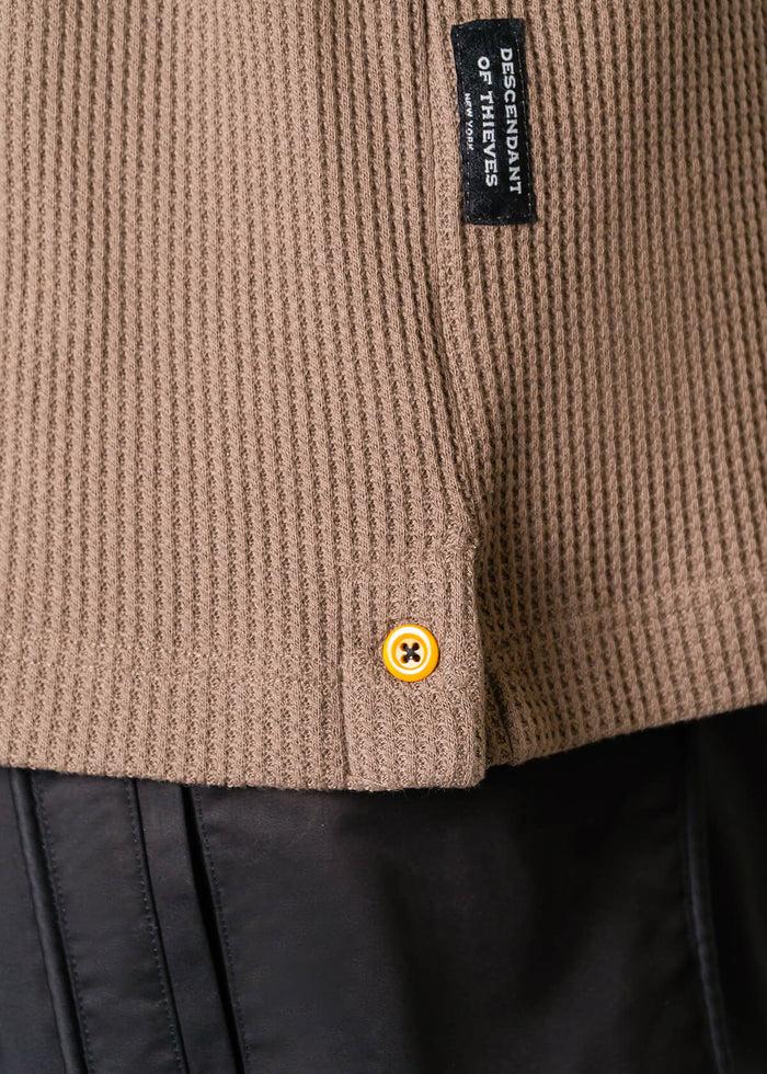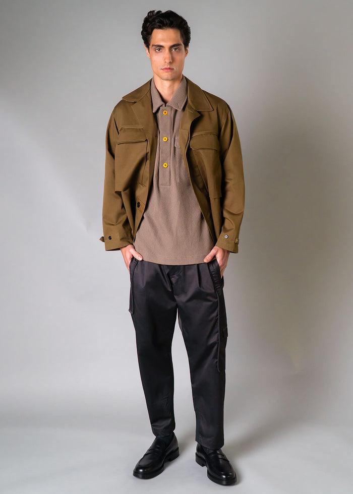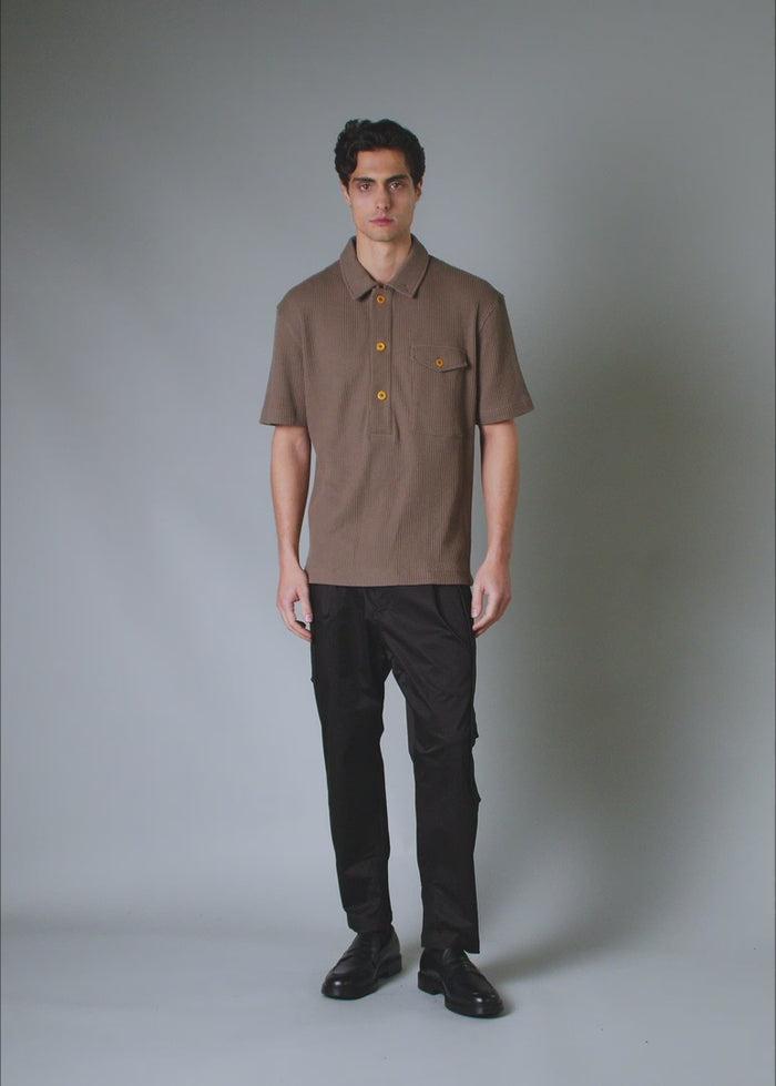 Achieve a vintage-inspired modern look with this relaxed-fit (RLX) Polo. Designed with a structured collar that buttons up to function as a wind guard and a three-button elongated placket. A flap chest pocket adds a utilitarian touch, while side hem snap buttons offer versatility. The polo shirt originated in the late 19th century as attire for polo players, featuring a button-up design for style and practicality. Later, it gained popularity in industries like construction and manufacturing for its rugged construction and comfort, making it ideal for labor demands. This particular polo was inspired by a vintage workwear polo used by mechanics in the automobile industry, sourced from our vintage vaults.  Button closure side vent Ingredients: 30% cotton, 70% poly Small Batch: 150 units made (# listed on inside label) Single Release Item: No restock after it's sold out Machine washable Fit Guarantee: Return within 45 days if not satisfied Ships from New York City Relax (RLX) Fit: Our Relax Fit is approx one size bigger than our standard fit and not tapered at the waist. Model is wearing size medium. Height: 6'2"