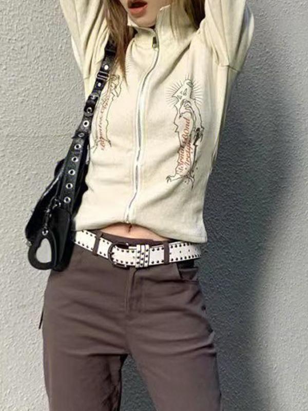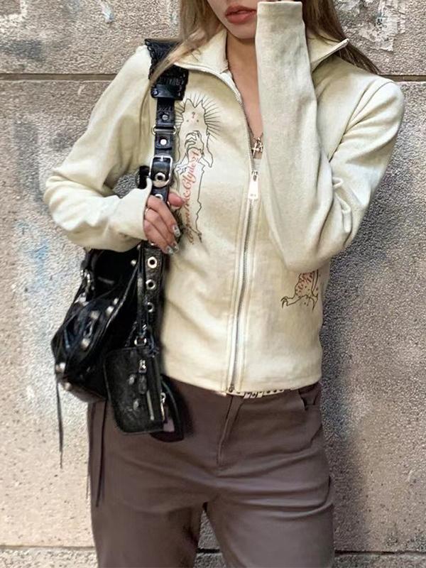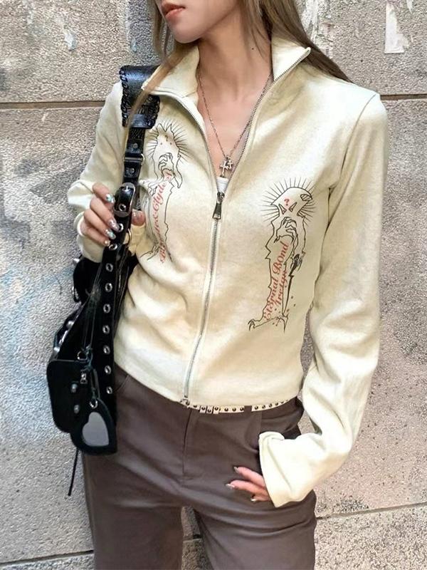 Vintage Print Lapel Neck Zip Up Long Sleeve Knit