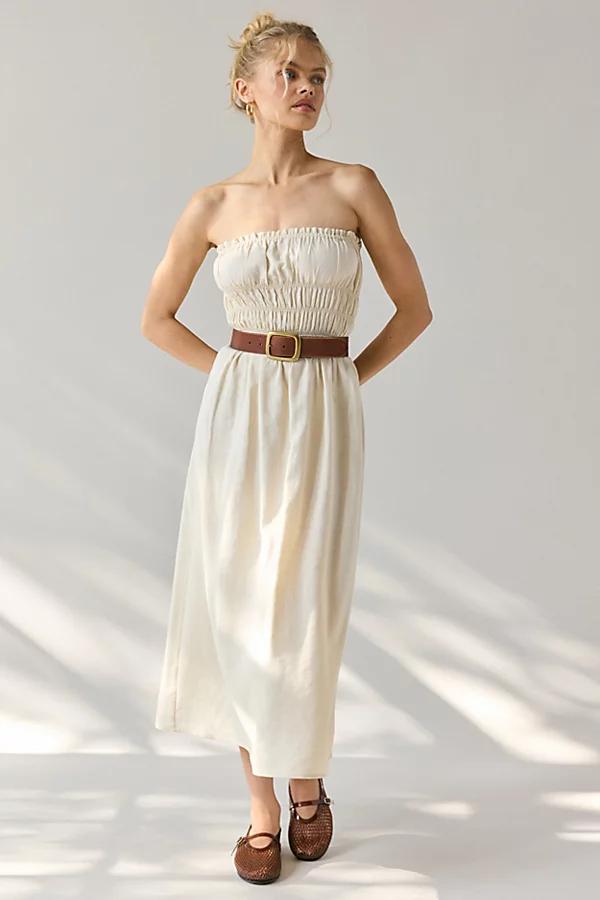 ReMADE By UO EcoVero Linen midi dress. This lightweight linen dress features a strapless tube neckline, stretchy ruched bodice and flowing skirt. The Linen collection uses European flax linen & viscose blend fabric. Each piece is made in LA. Features ReMADE By UO Made In LA EcoVero Linen ruched tube midi dress Linen midi dress Strapless tube neckline Ruched bodice A-line fit Midi length Easy pull-on style ReMADE By UOs Linen collection is made from European flax linen & viscose Brand new desi