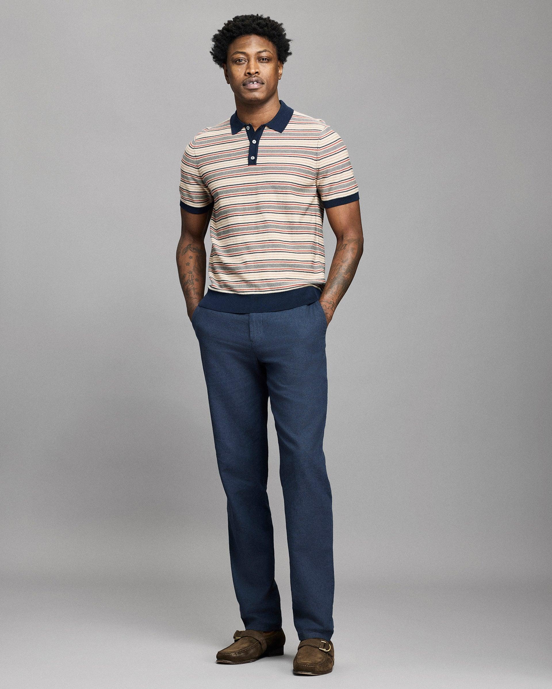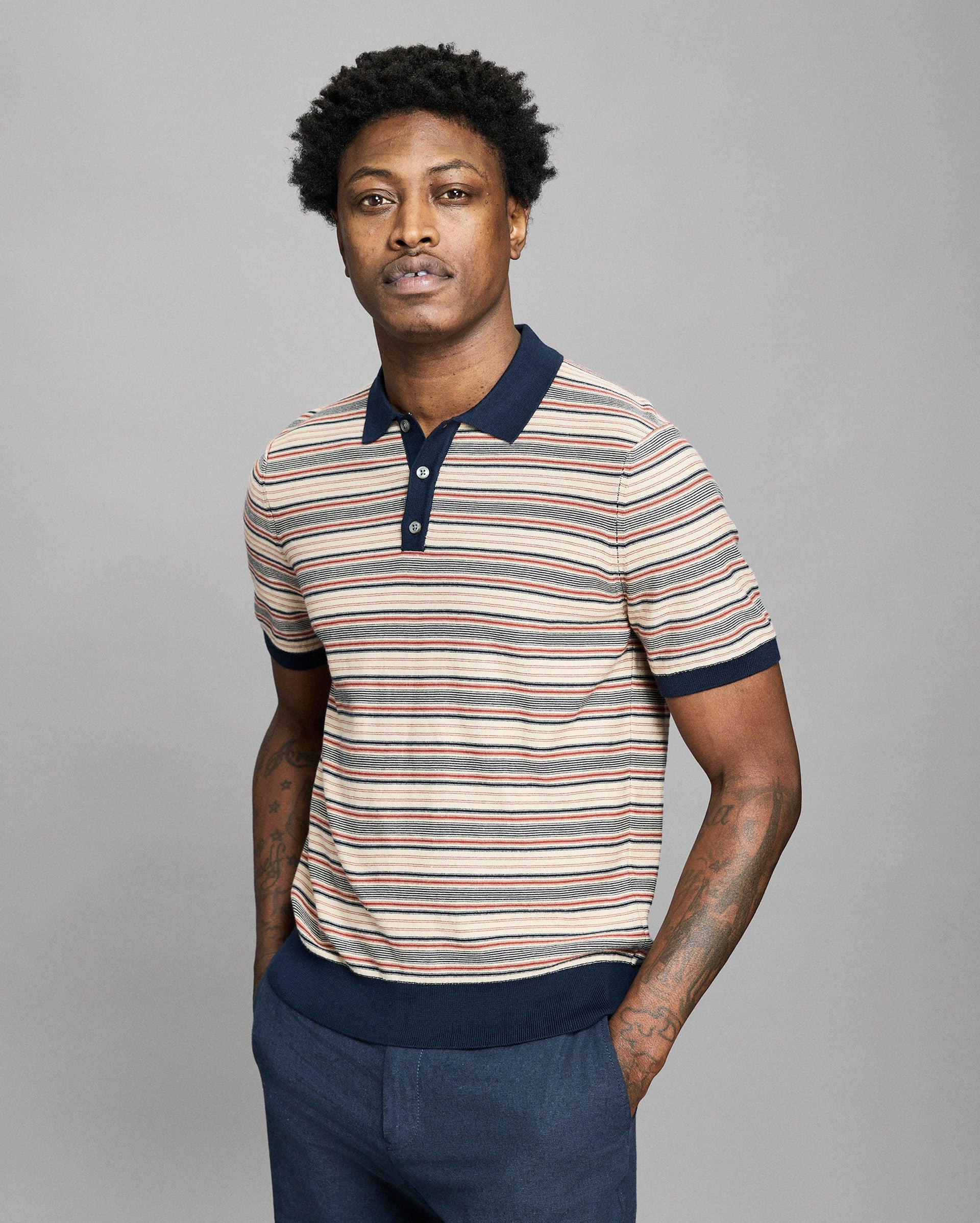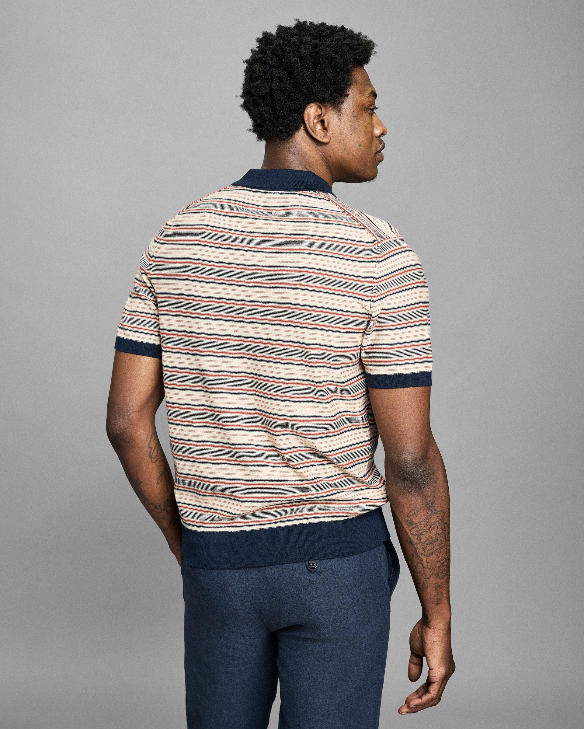 Blending the shape and charm of a vintage polo with the luxurious construction of a sweater, this piece embodies timeless style. Crafted in a soft cotton with a subtly textured stripe. An instant classic that dresses up or down with ease and is thoughtfully finished with smoke mother-of-pearl buttons and our signature