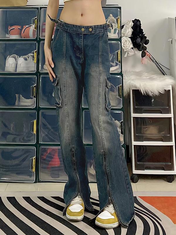 Vintage Wash Multi Pocket Zip Up Cargo Jeans