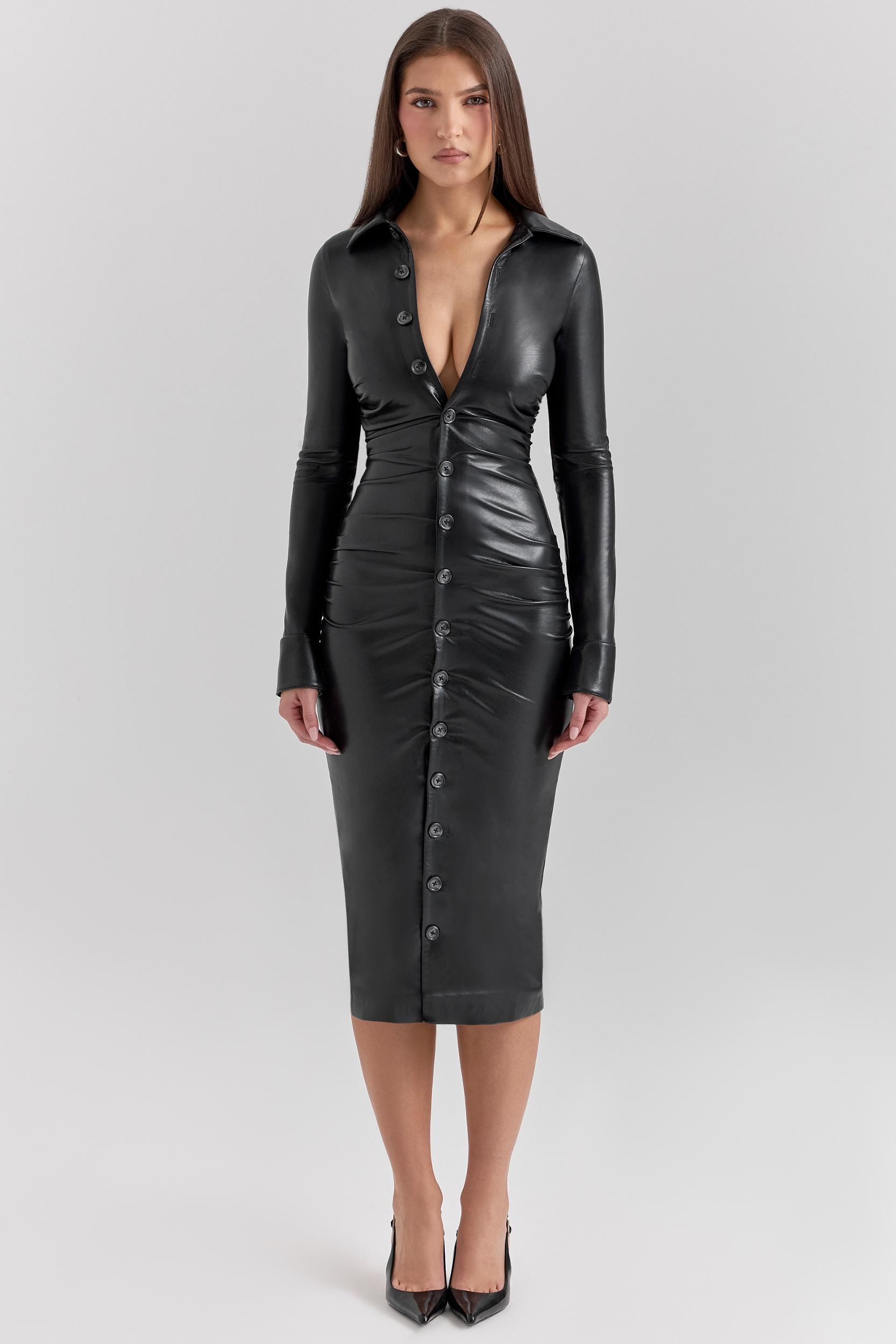 We mean business in the 'Viola' Dress. Do you know about our vegan leather? It's buttery soft and we've added an internal stretch lining that ensures our signature House of CB fit is absolutely on point. It's expertly cut to a long sleeve midi silhouette featuring a statement collar and deep plunging neckline. Buttons down the front add versatility to the look, while delicate gathering creates a shape that highlights all the right places.