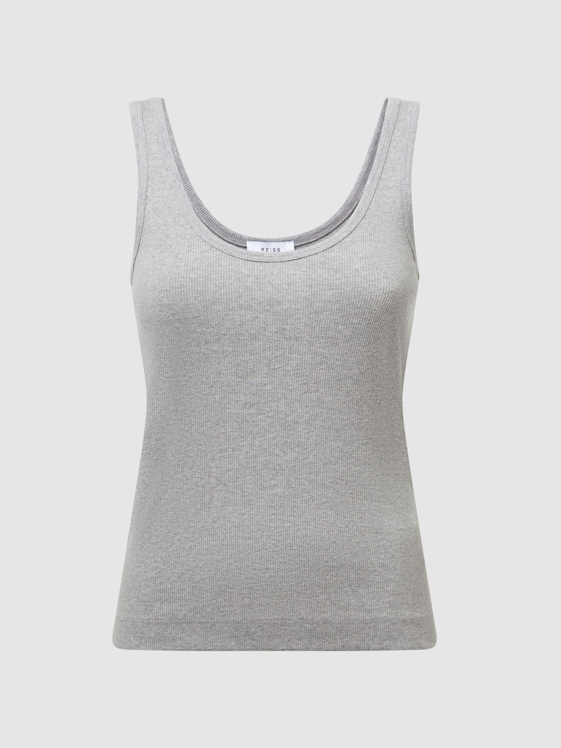 Featuring a scooped neckline and sleeveless silhouette, the Violet ribbed jersey vest top in grey marl fits close to the frame, which makes it perfect for layering and as a staple in any wardrobe. Wear yours with everything from casual jeans and trousers to office-ready pencil skirts. Ribbed construction. Scooped neckline. Sleeveless. Fitted design. The model is wearing a size S. Measurements of model: Height 5ft 10'' / 178cm.