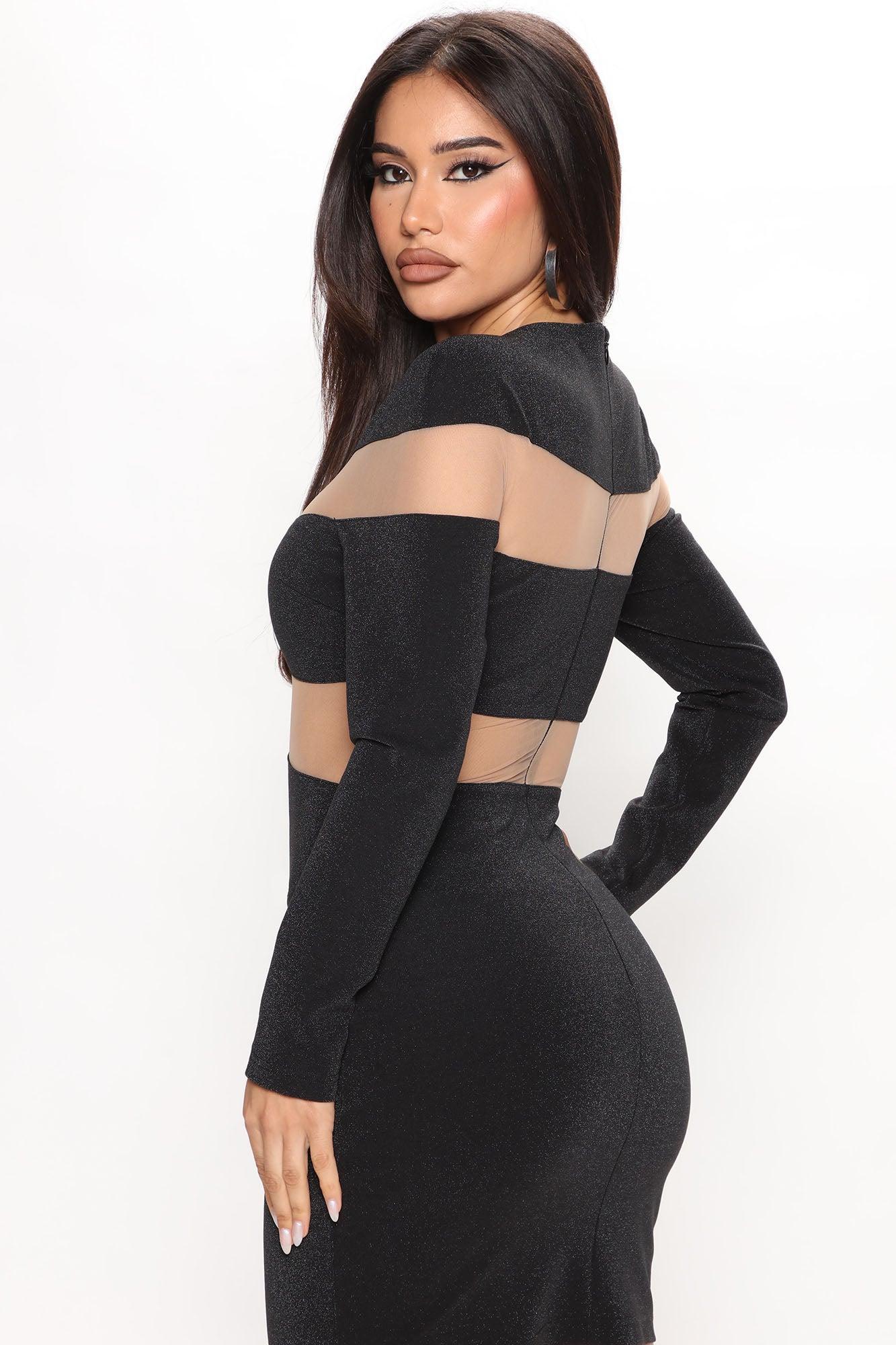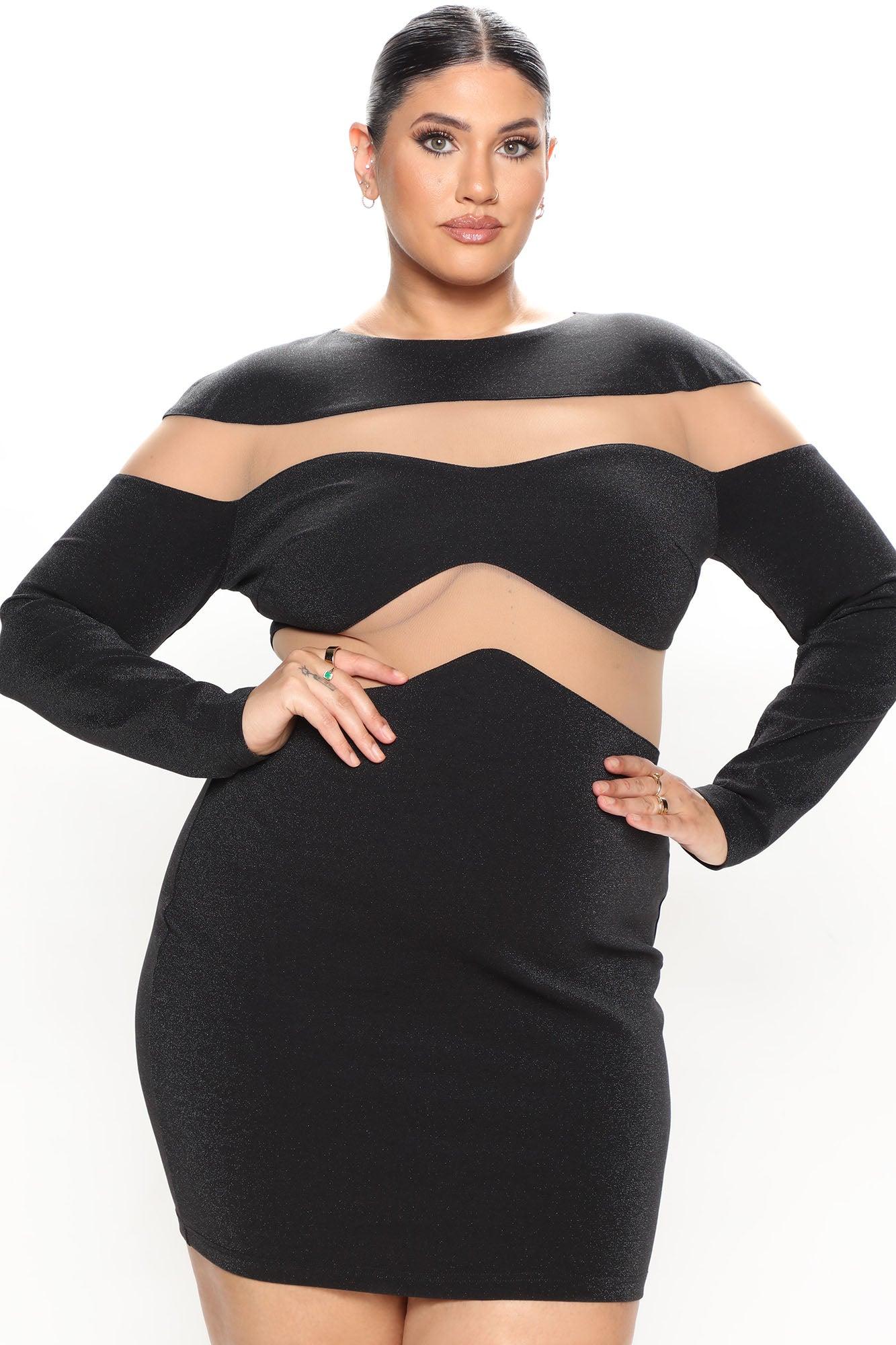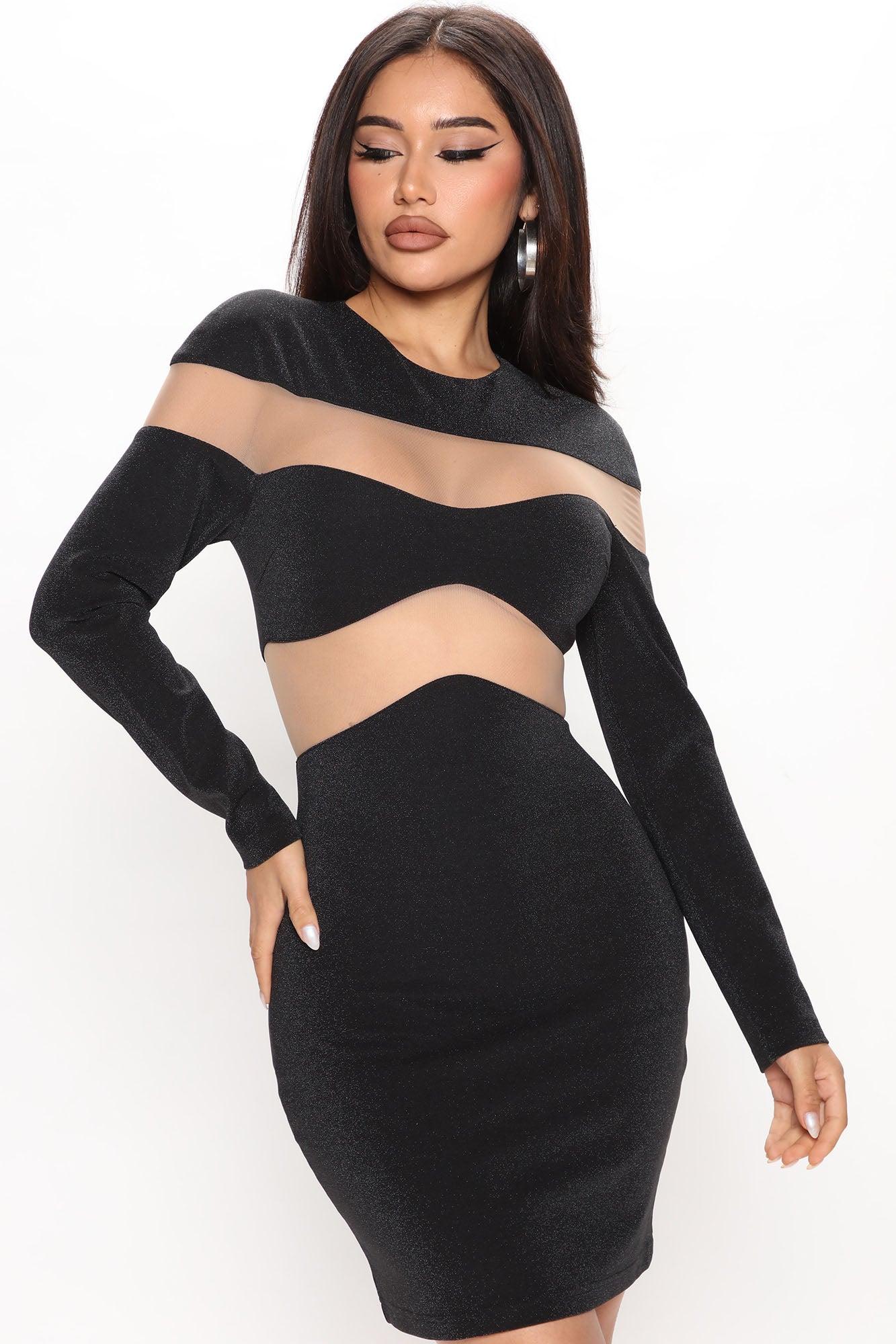 Available In Black. Mini Dress Long Sleeve High Neck Mesh Insert Hidden Back Zipper Stretch Shell 1: 42% Rayon 42% Nylon 11% Lurex 5% Spandex Shell 2: 92% Nylon 8% Spandex Imported