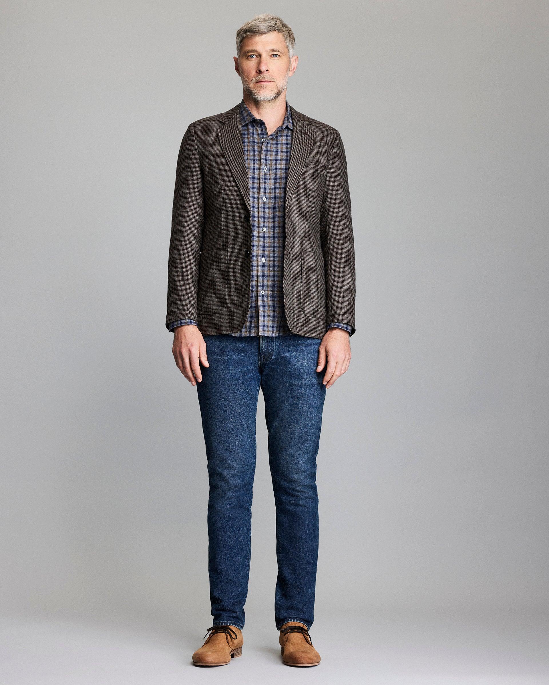 A longtime favorite returns: our Walton Jacket is a modern yet slightly more structured option than our iconic Archie Jacket. Made in Italy, it comes in a rich virgin wool in a classic brown houndstooth plaid that wears beautifully all year round. It’s half-canvassed and three-quarter-lined with our signature pelican m