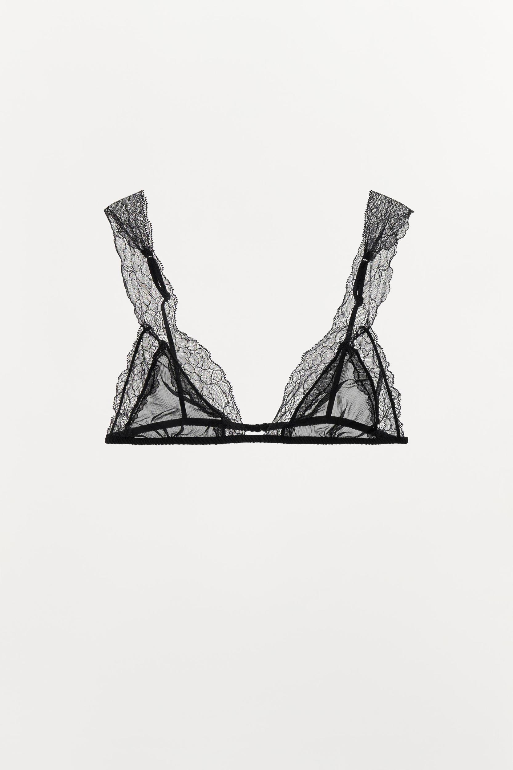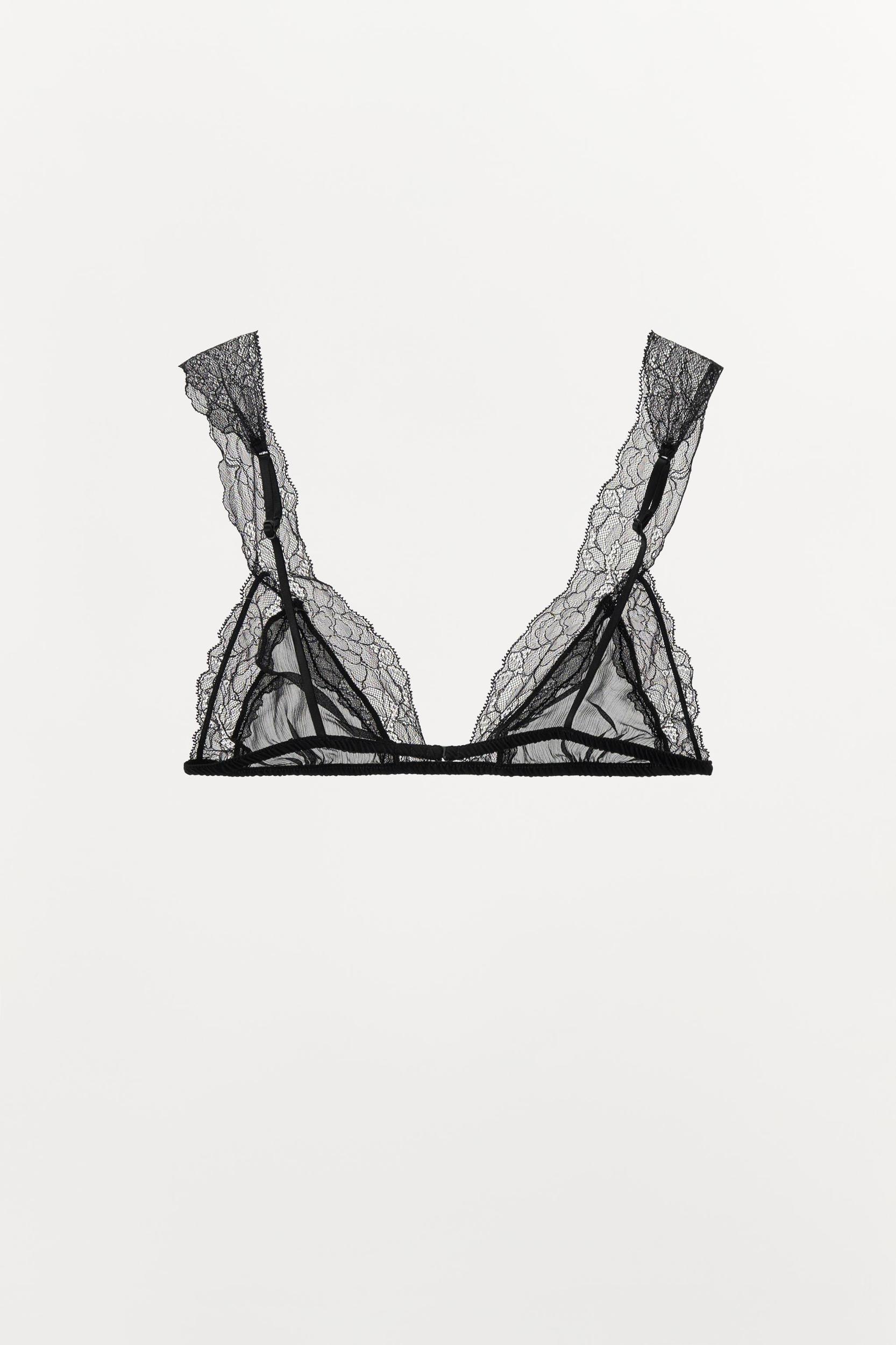 Triangle bralette made of 100% viscose yarn. Adjustable thin straps. Matching lace appliqué detail. Back closure with metal hook.