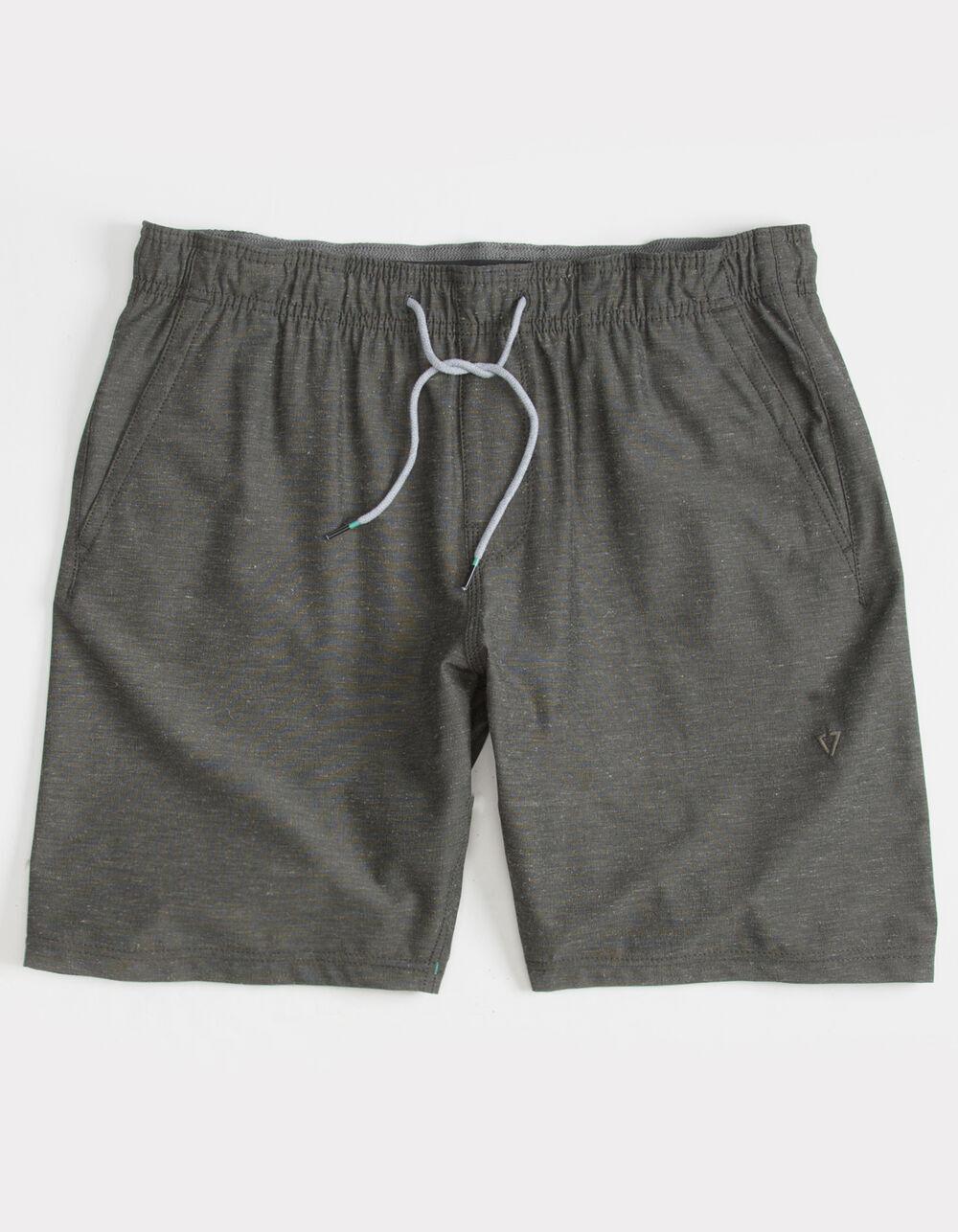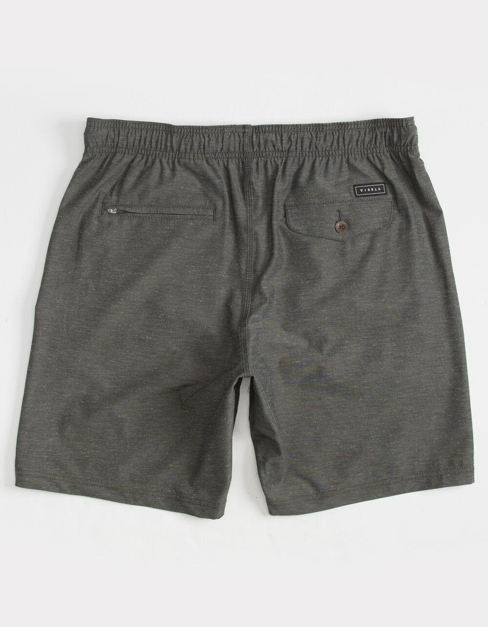 Vissla Hemp No See Ums Elastic Shorts. Elastic drawstring waist. Faux fly. Front slant pockets. Back welt pocket. Patch pocket with button flap closure. Vissla patch above pocket. Embroidered V at left front leg. 69% recycled polyester/17% cotton/7% hemp/7% spandex. Machine wash. Imported.