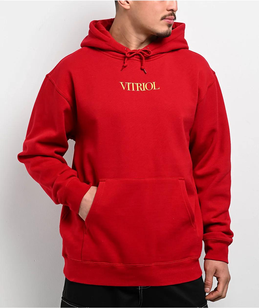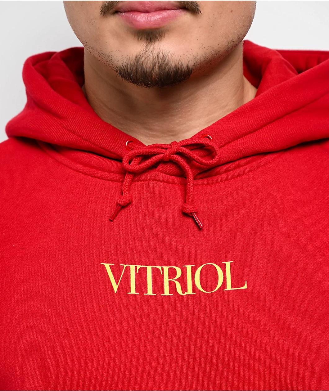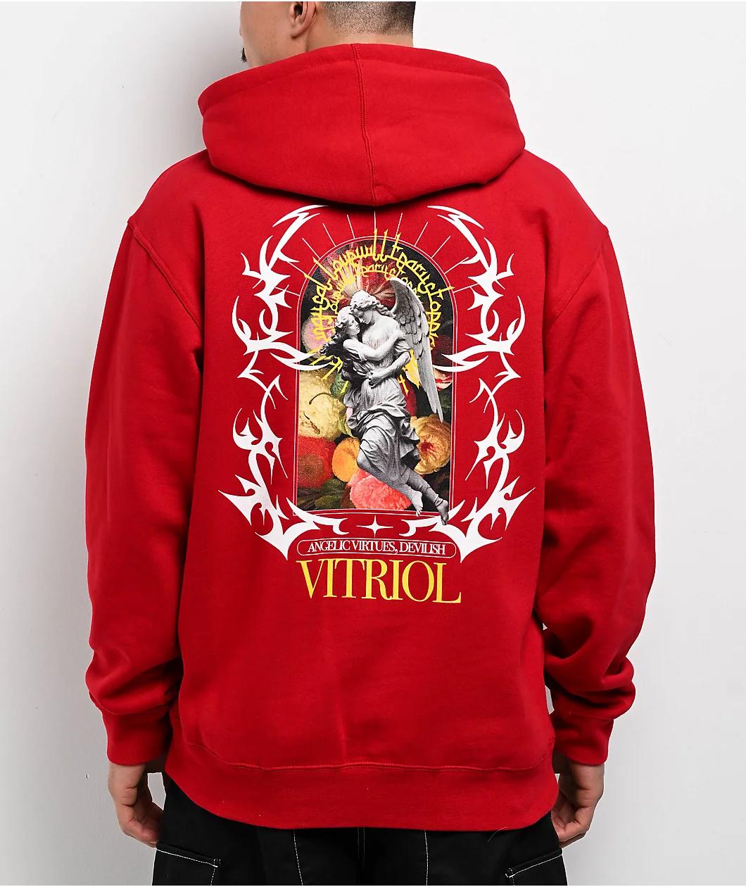 Arriving in a "Scarlet" red colorway, the Angelish hoodie from Vitriol displays printed graphics on the front and back. Centered on the front of the sweatshirt is vibrant yellow branding, while the back showcases a sculpture of two angels hugging, ad