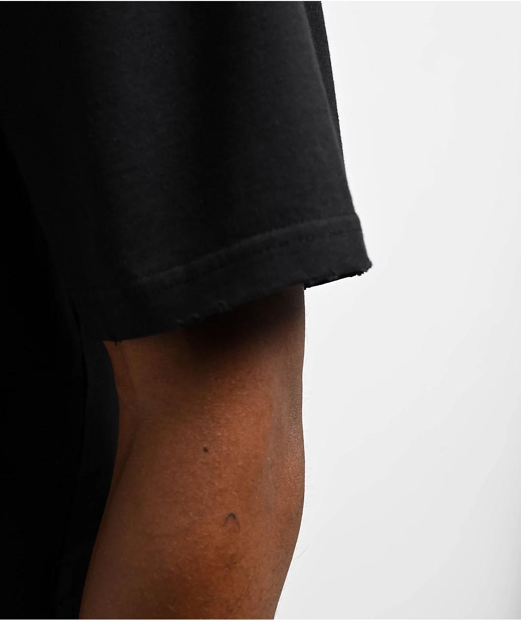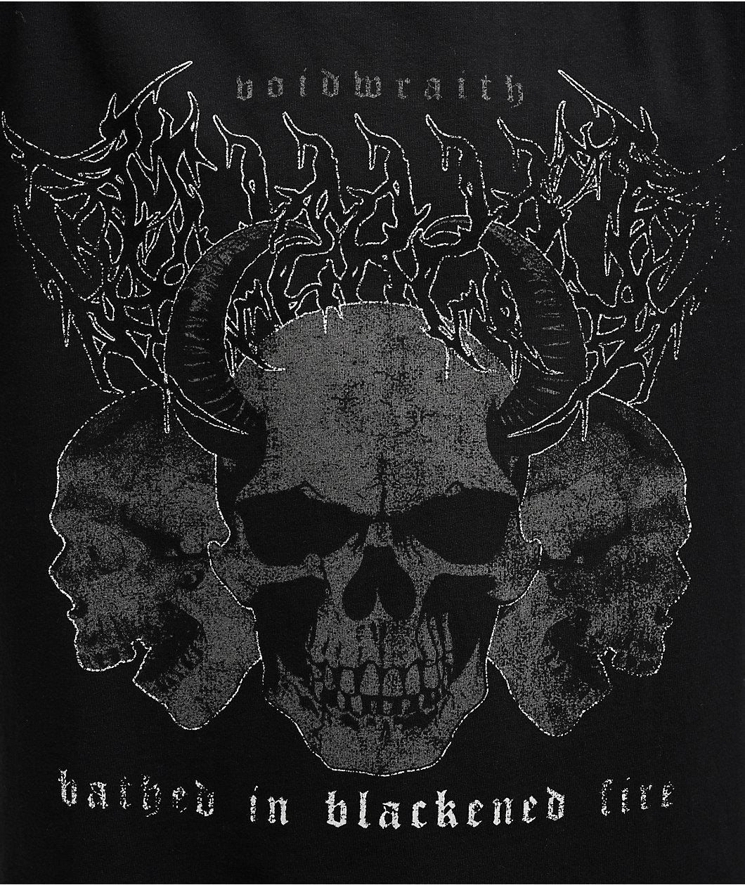Adopt an alternative look with this blackened fire skull t-shirt from Vitriol. A large graphic of demonic skulls burning with black fire accompanied by gothic white text reading "bathed in blackened fire" makes a statement in any casual outfit.