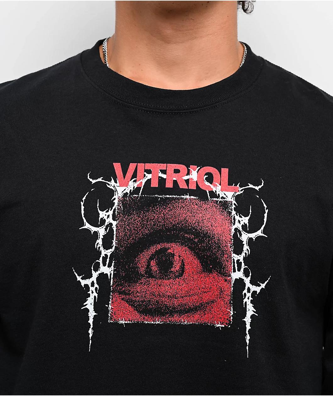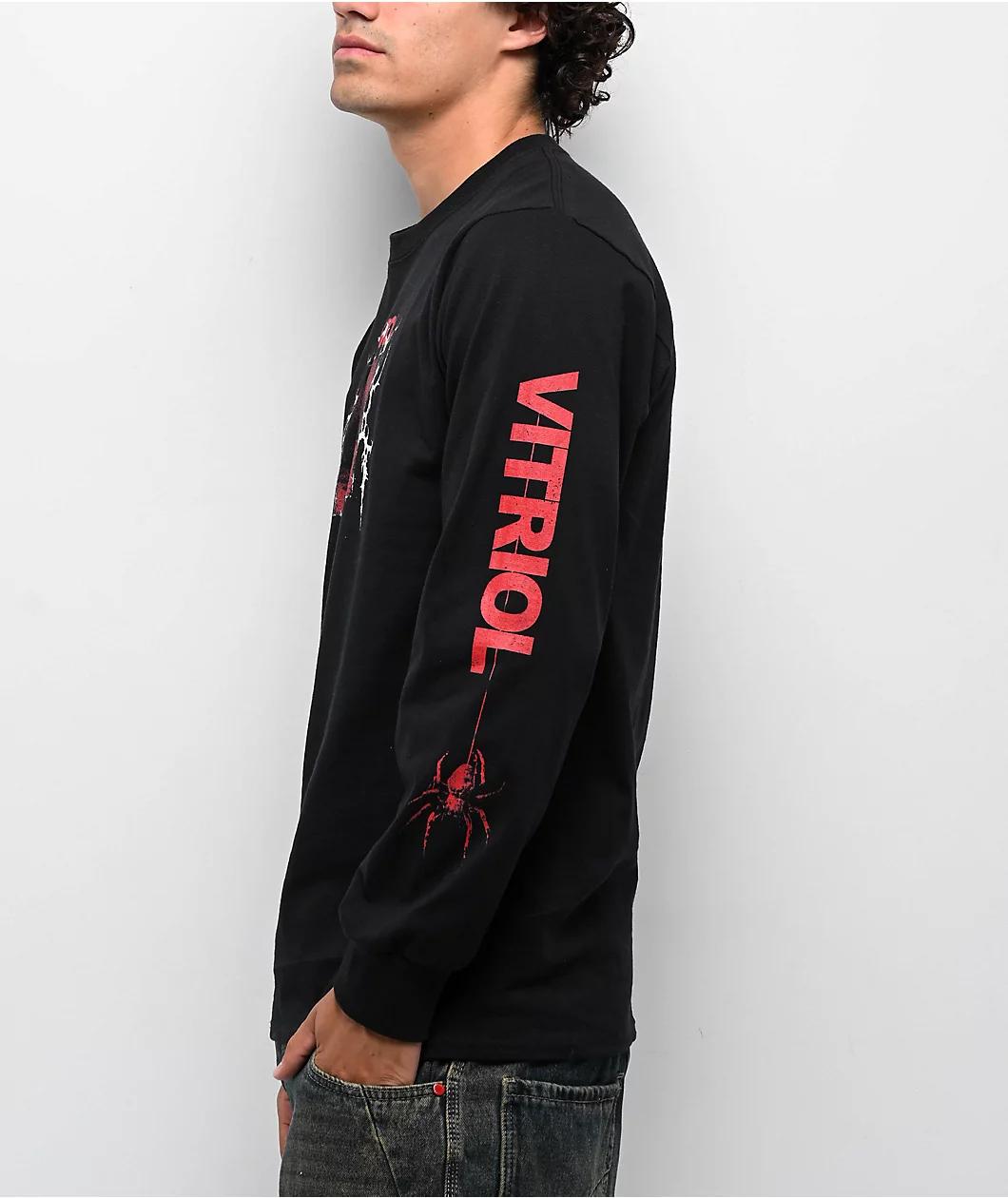 Vitriol delivers the Bold Red long sleeve t-shirt in a bold black colorway with eerie detail. A red eyeball graphic creeps across the chest, paired with bold branding and a dangling spider crawling on the sleeve.