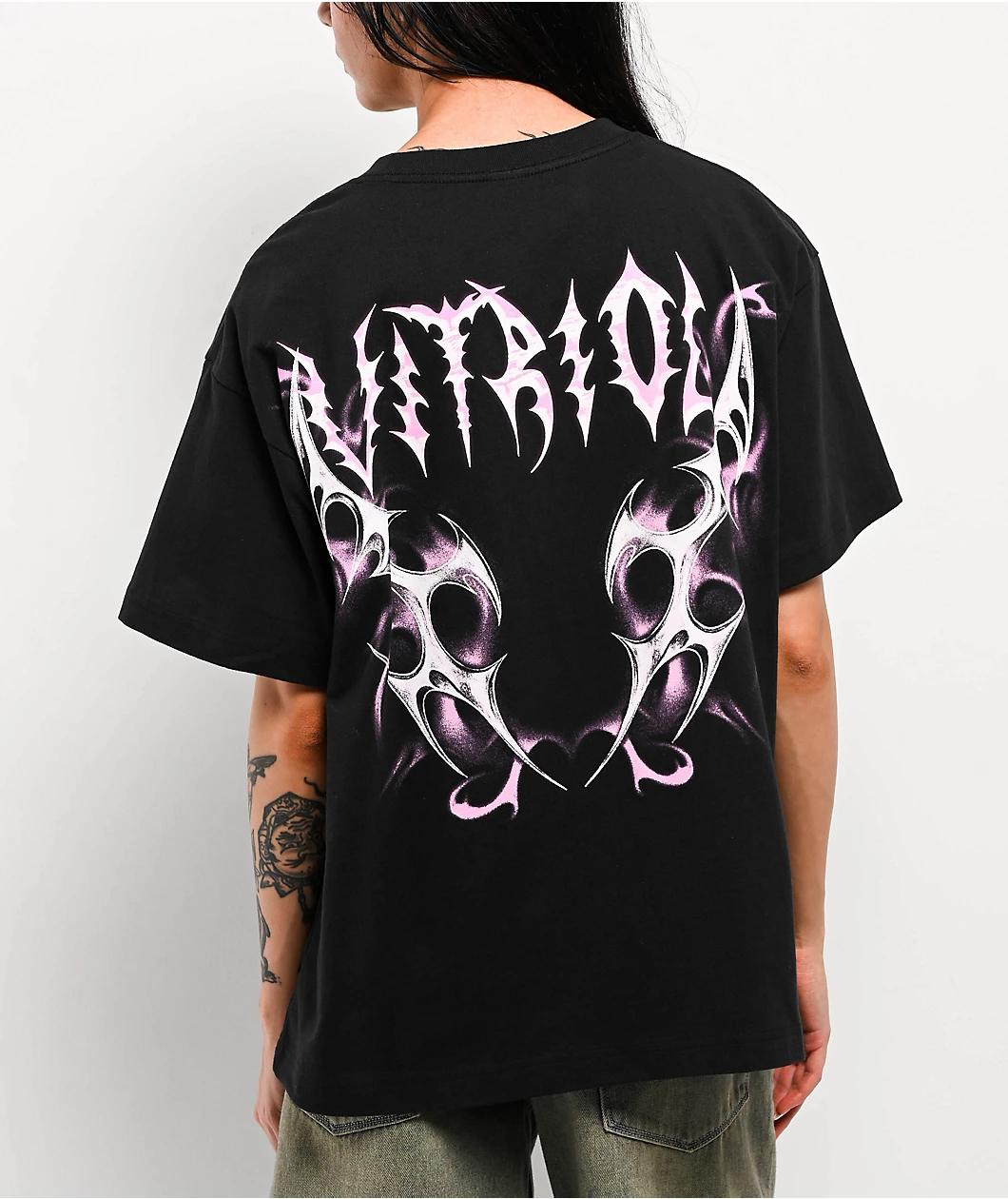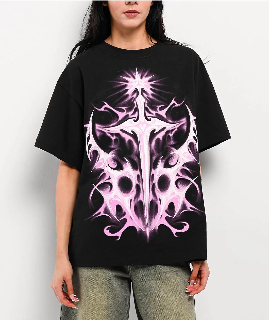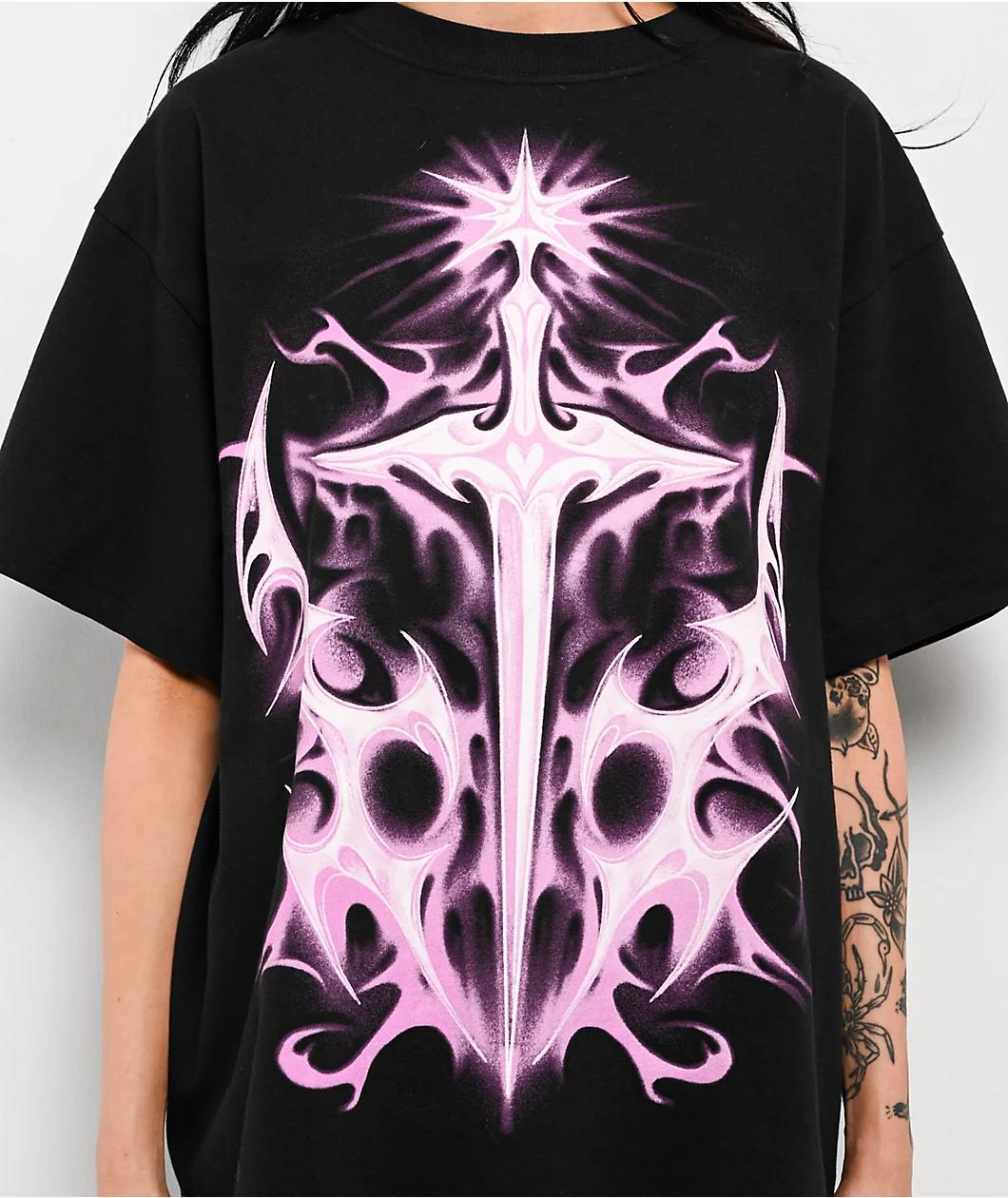 Add Y2K flair to any outfit with the Cyber Slay t-shirt, arriving from Vitriol in a versatile black cotton build with pink and white graphics printed on the front and back. The front of the short sleeve displays a large sword with a heart on the hilt