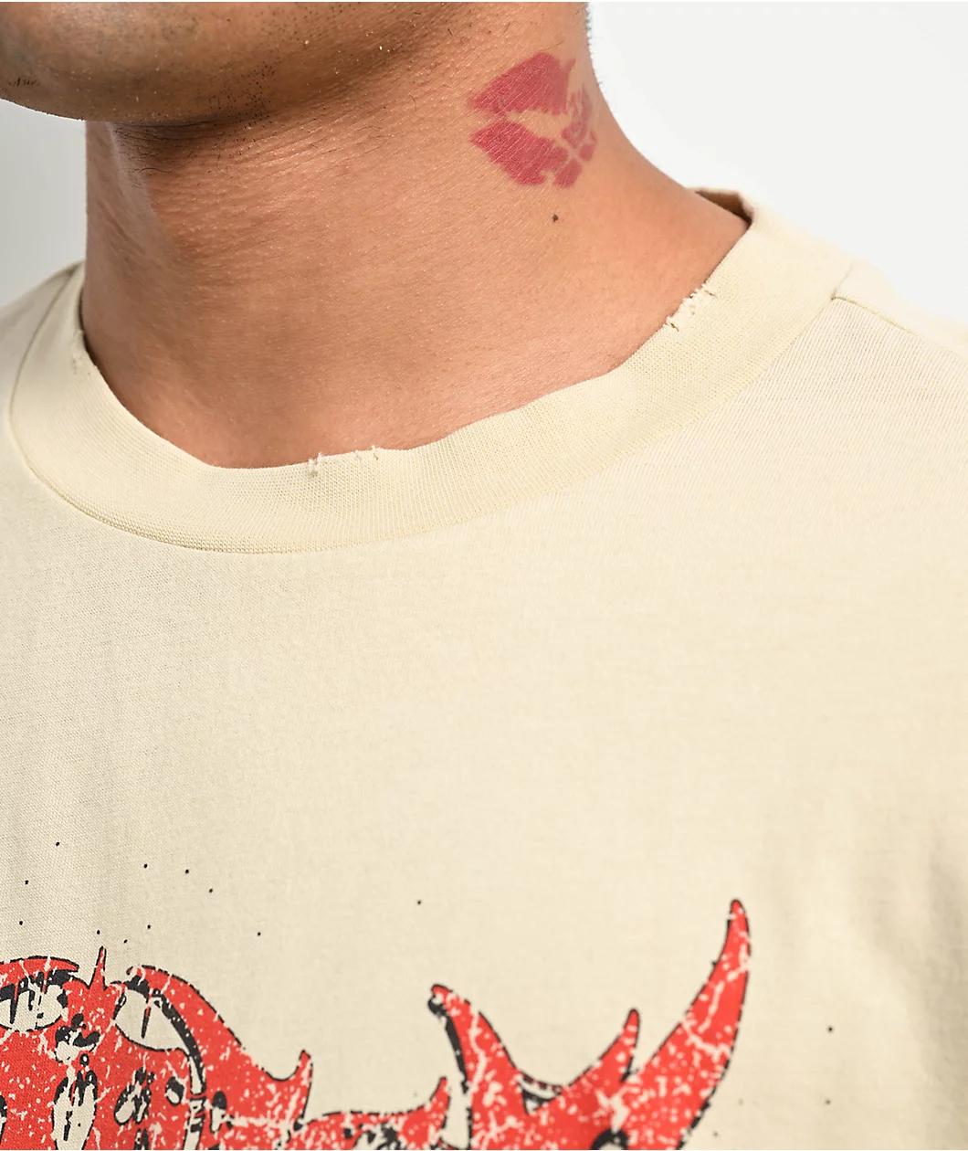 Vitriol introduces the Knights Castle Wall t-shirt in a natural colorway with lightly distressed accents throughout. The front delivers branding across the chest in a red metal-inspired font with a gothic mirror below showing a grim reaper - "The end
