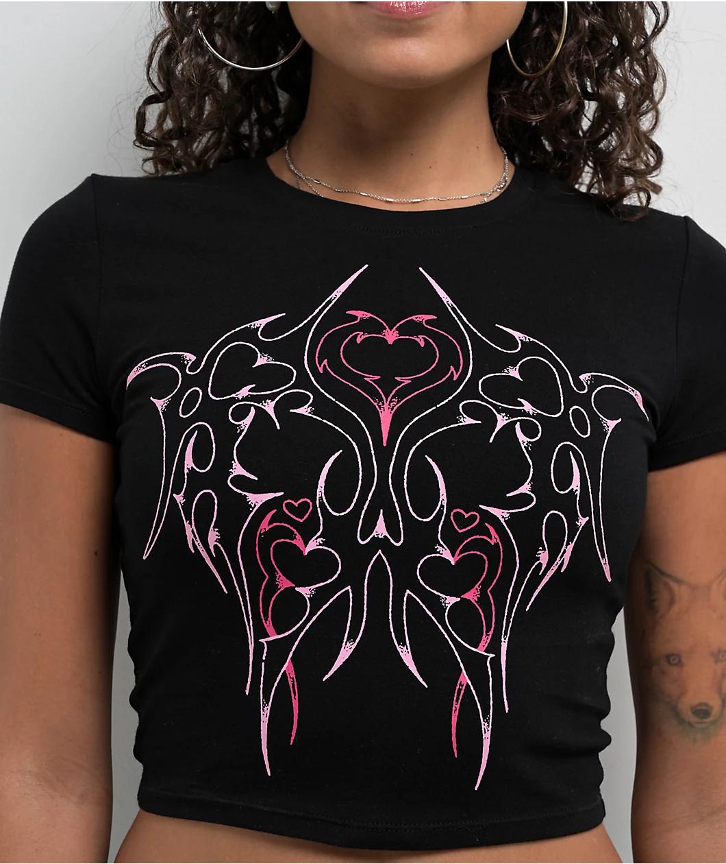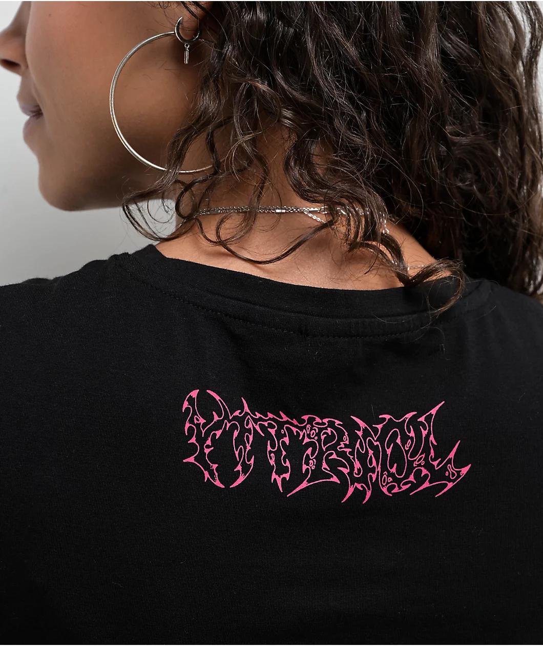 Add a Y2K vibe to any outfit with the Lina Dark Rave black crop t-shirt from Vitriol. The front of the tee has edgy cyber sigilism designs decorated with hearts whereas the back showcases branding in a sharp metal-inspired font, for a tough, cute loo