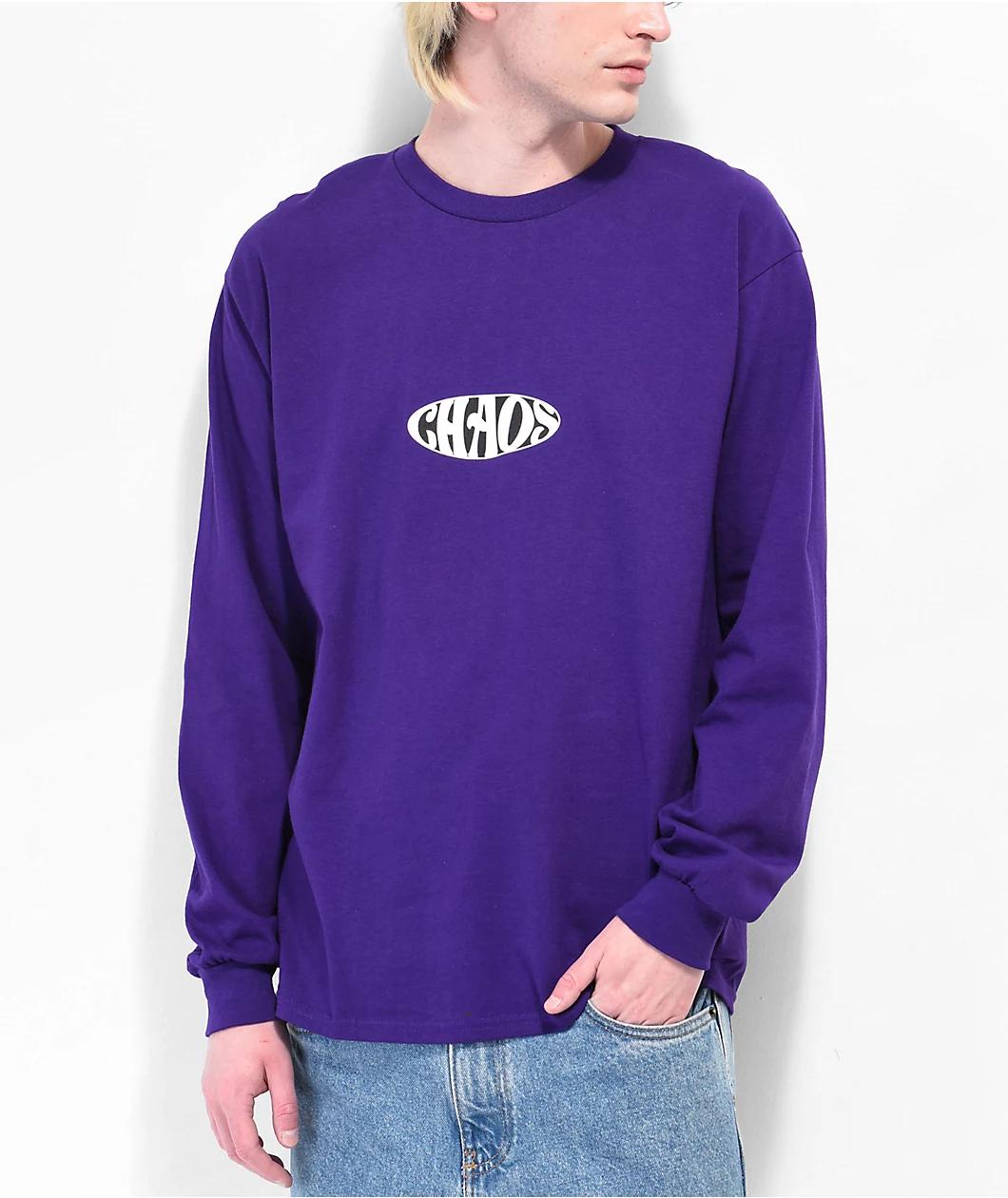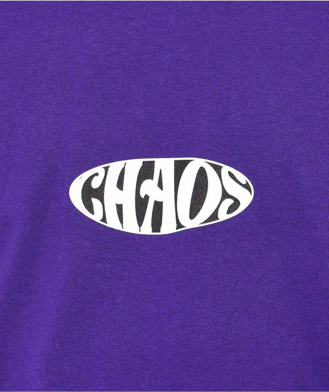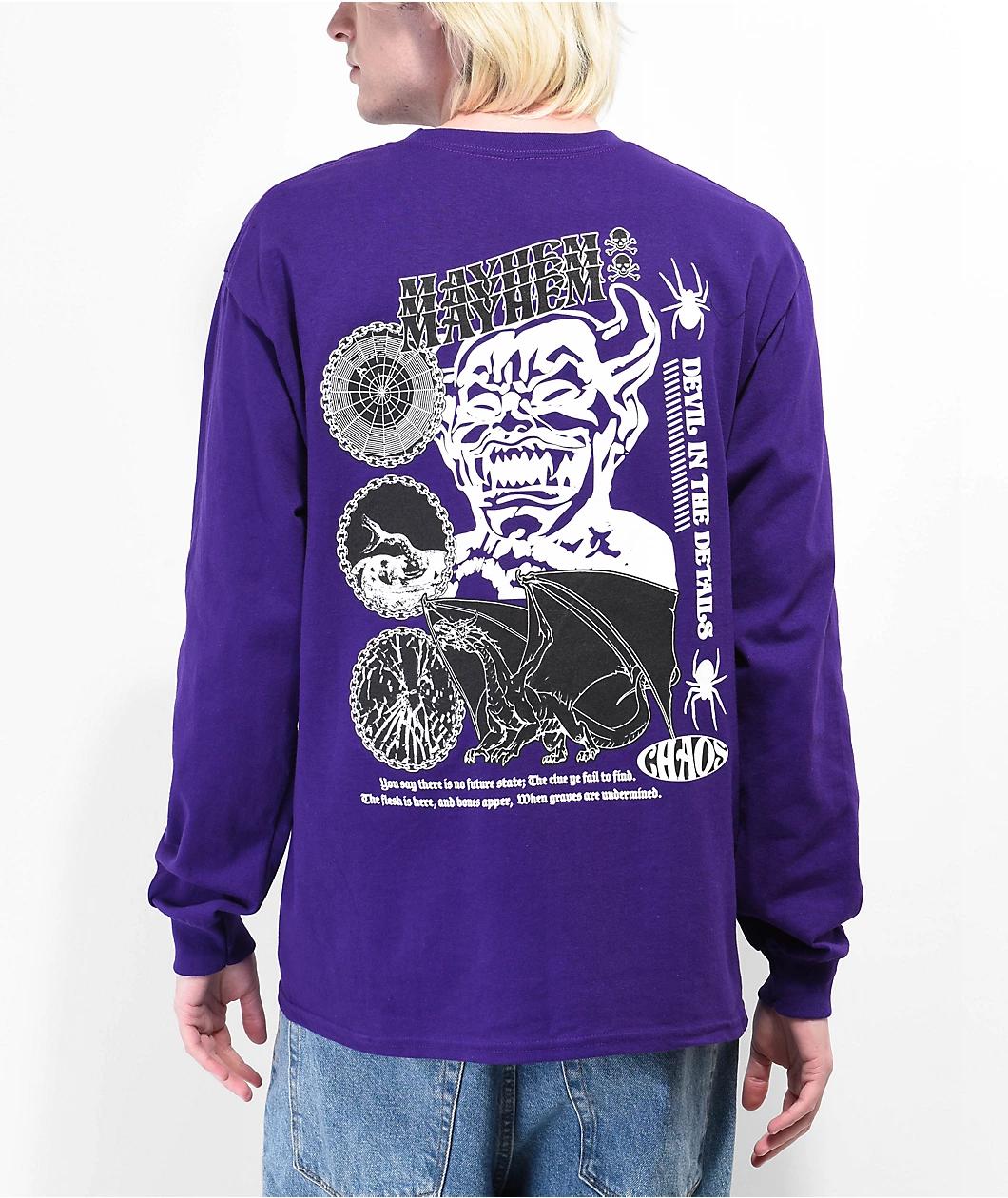 The Mayhem t-shirt from Vitriol comes in a long sleeve construction with a purple colorway, adorned on the front with a white, screen-printed brand logo. On the back is a screen-printed collage including a dragon and a broken mirror as well as script that