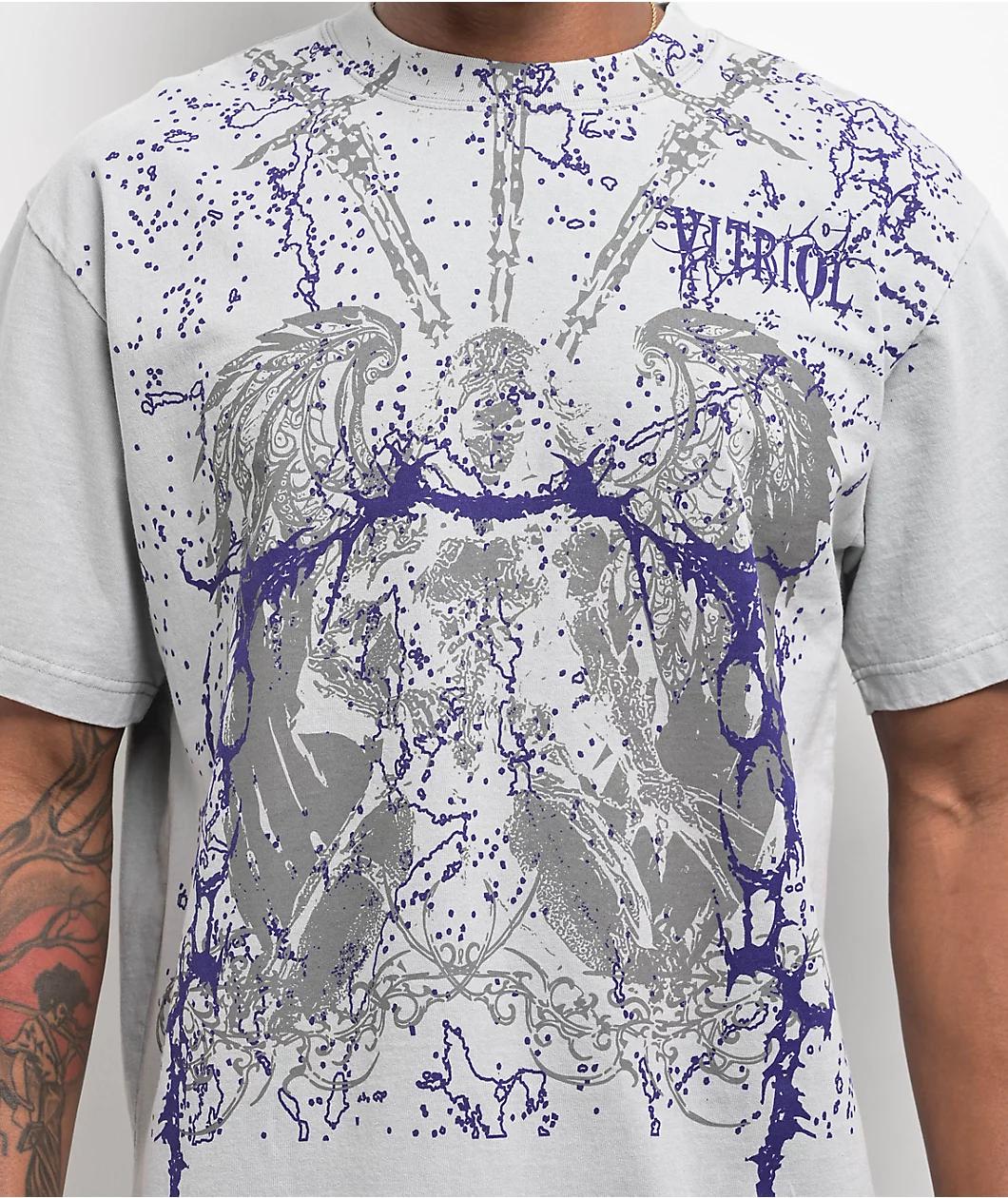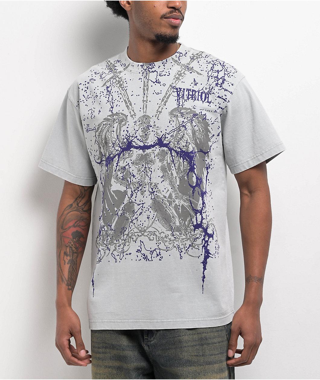 Add a modern emo vibe to your outfit with the Set Free grey t-shirt from Vitriol. Screen-printed on the graphic tee is a monochrome demon in the background of a cyber sigilism paint splatter-inspired design adorned with barbed wire and branding, cult