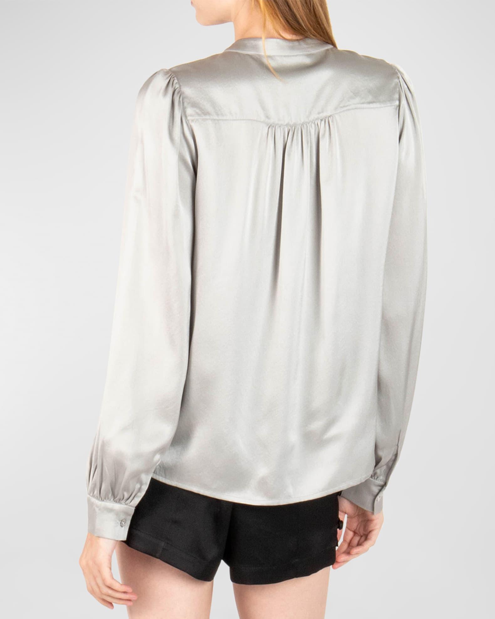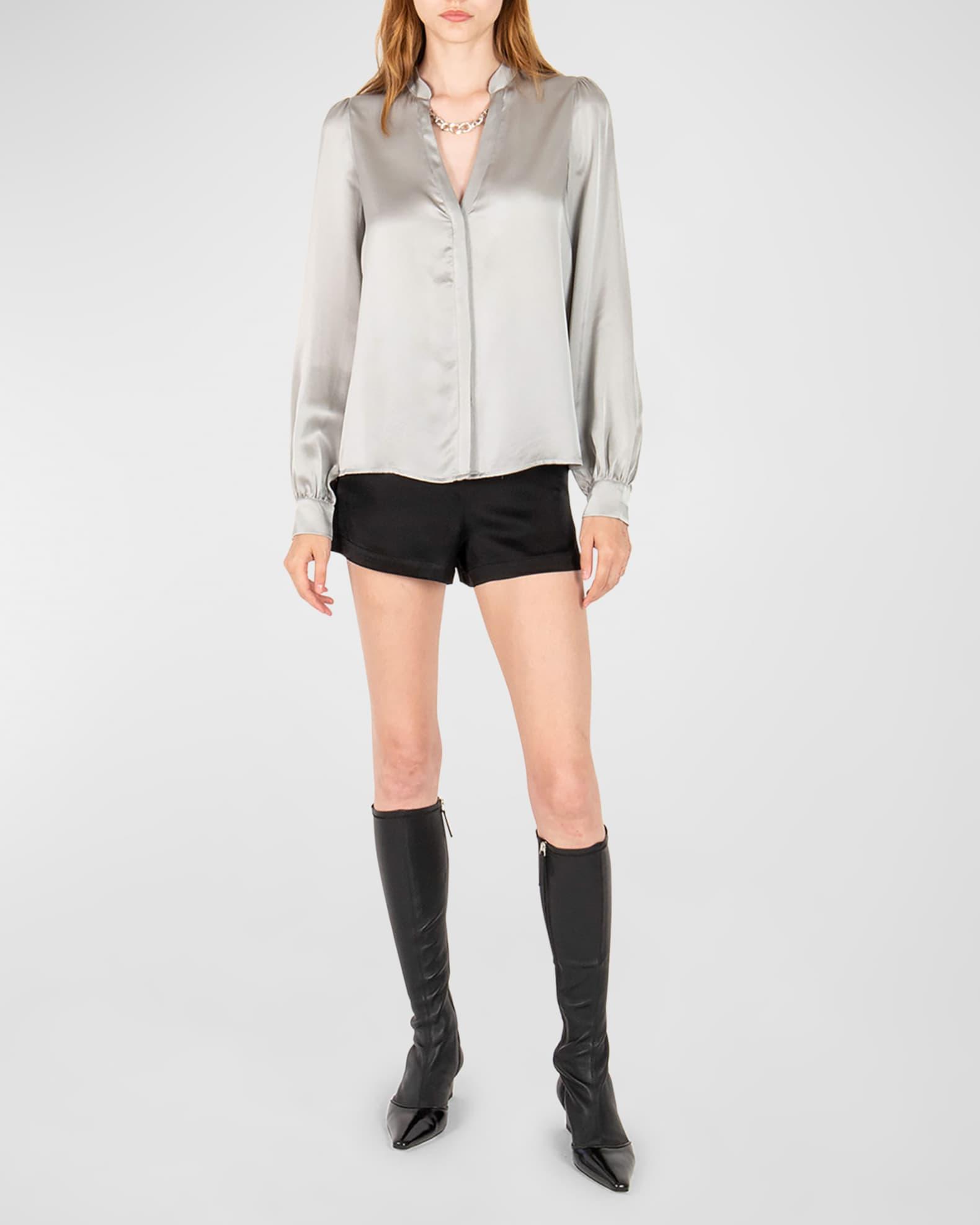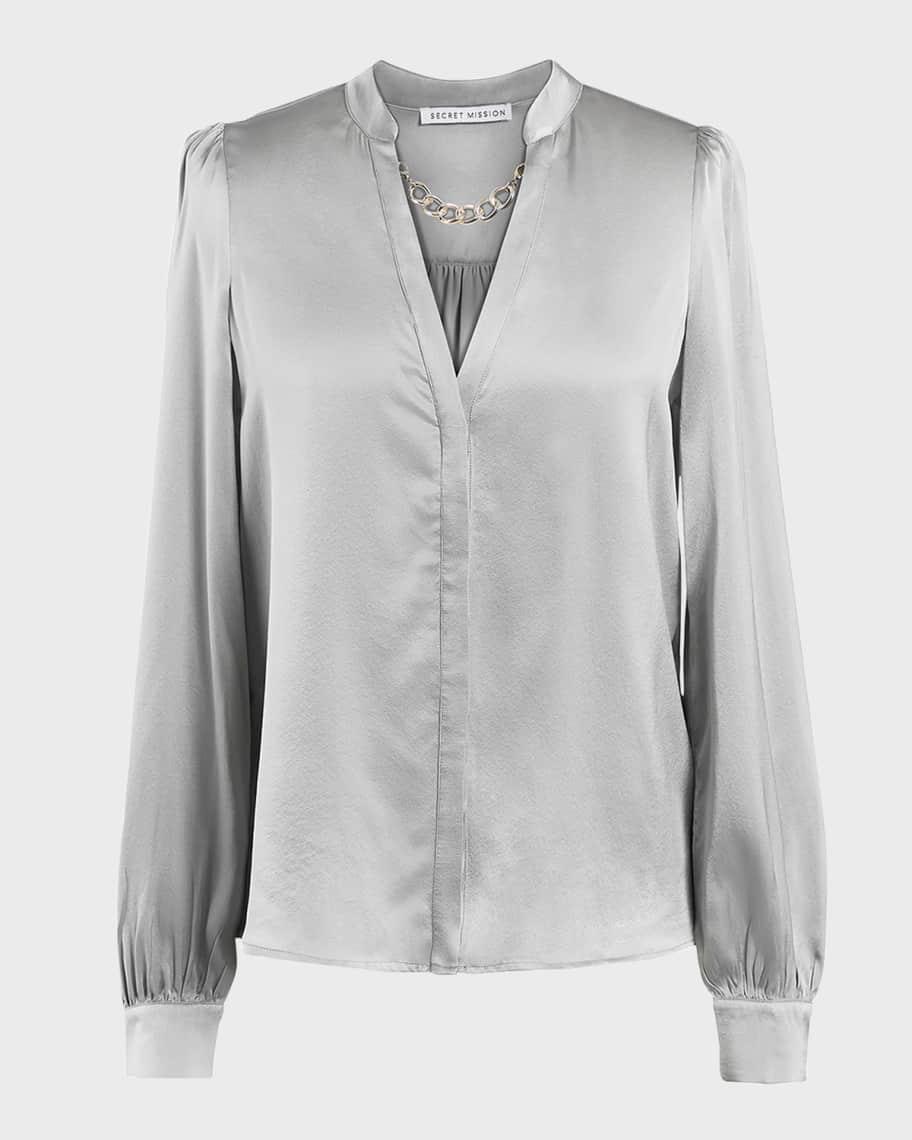 Secret Mission "Vivi" lustrous silk blouse accented with a removable chain detail Approx. 24"L from shoulder to hem V neckline; hidden button front Long sleeves; button cuffs Yoked back Relaxed fit Hip length Silk Hand wash or dry clean Imported Model is 5'10"/177cm.