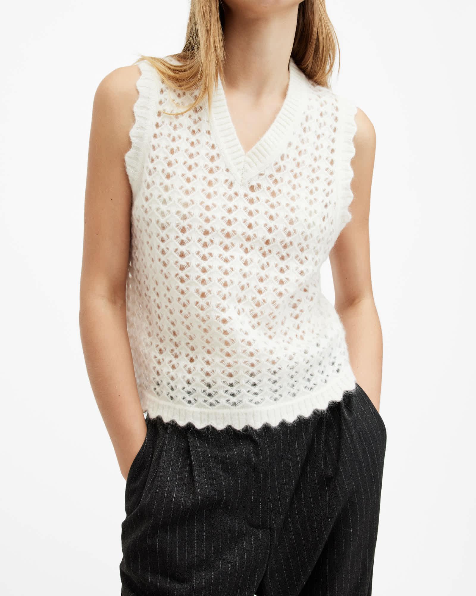 Transitional knitwear is here. This is the Vivian Tank Top. Made using a lightweight wool and mohair blend yarn that's been knitted using an open stitch technique. The sleeveless silhouette is complete with a scalloped edge trim, it's a pretty addition. Layer this piece over dresses and shirts - it's time to add texture to your wardrobe. This tank top is designed to a regular fit Pullover V-neck Sleeveless Open stitch technique Scallop edge AllSaints branded buttons Midweight
