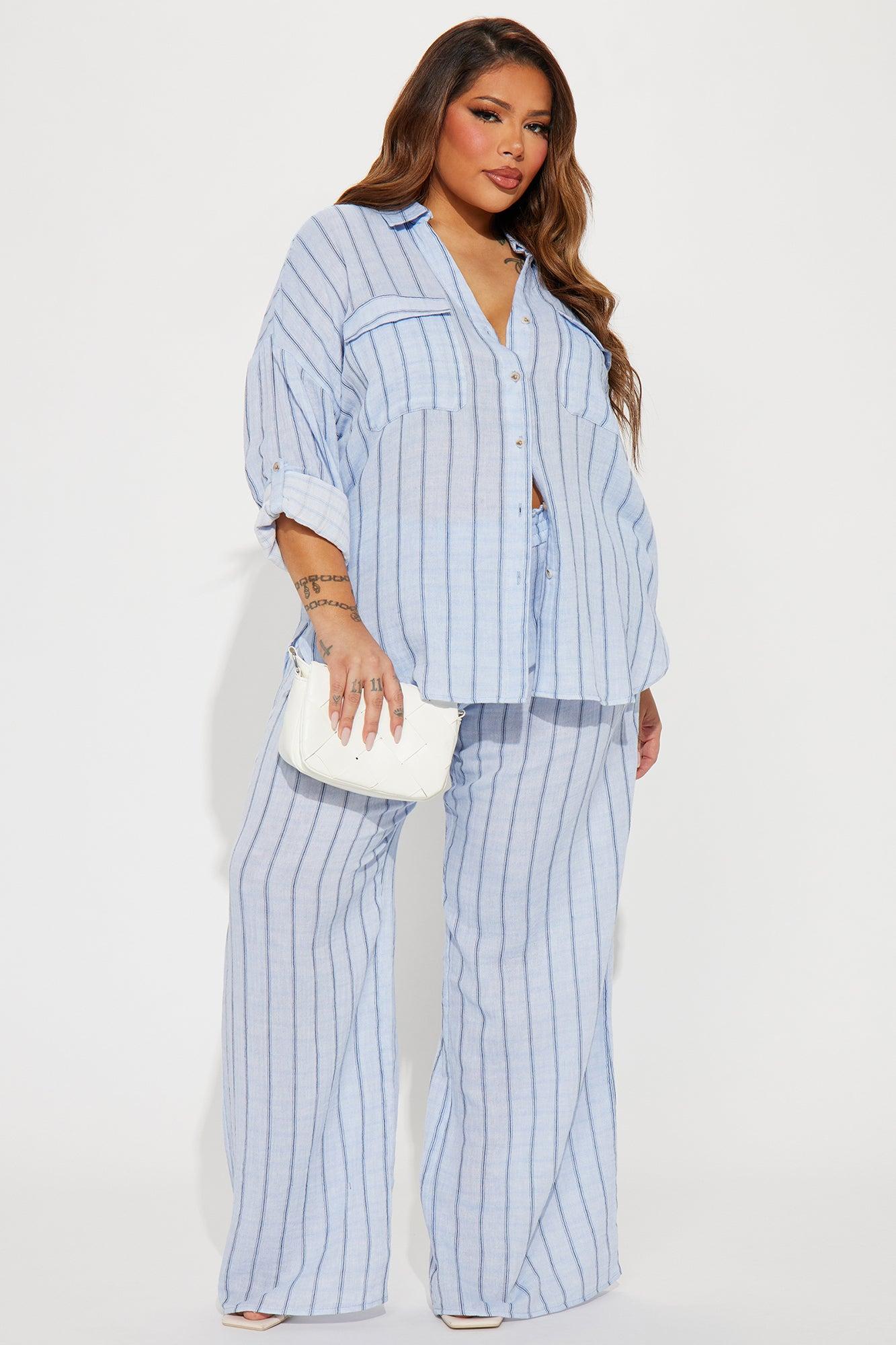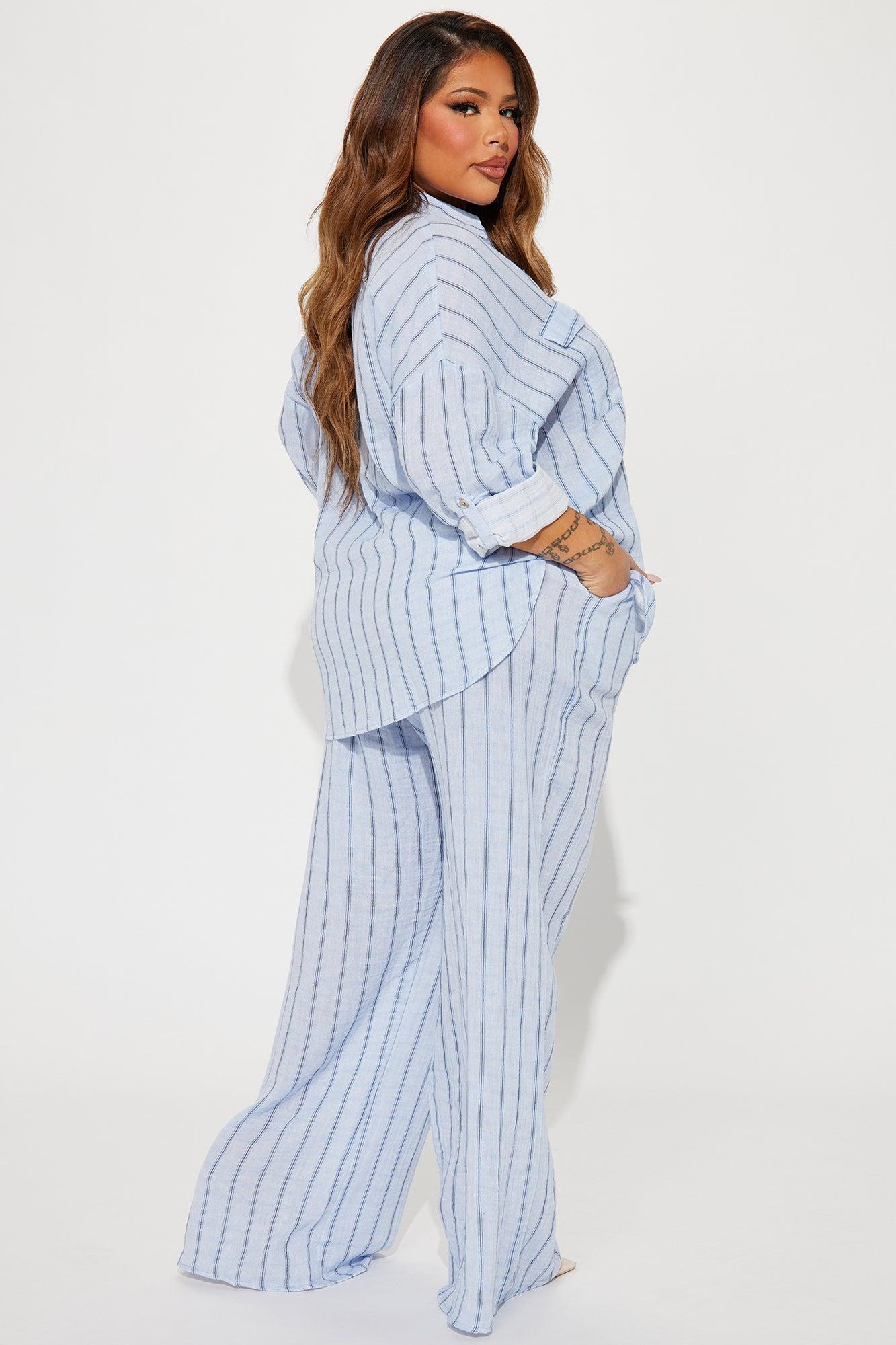 Available In Light Blue And White. Pant Set Shirt Collar Long Sleeve Button Up Front Flap Pockets Wide Leg Pant Elastic Waistband Pockets Non Stretch 32" Inseam 100% Cotton Imported