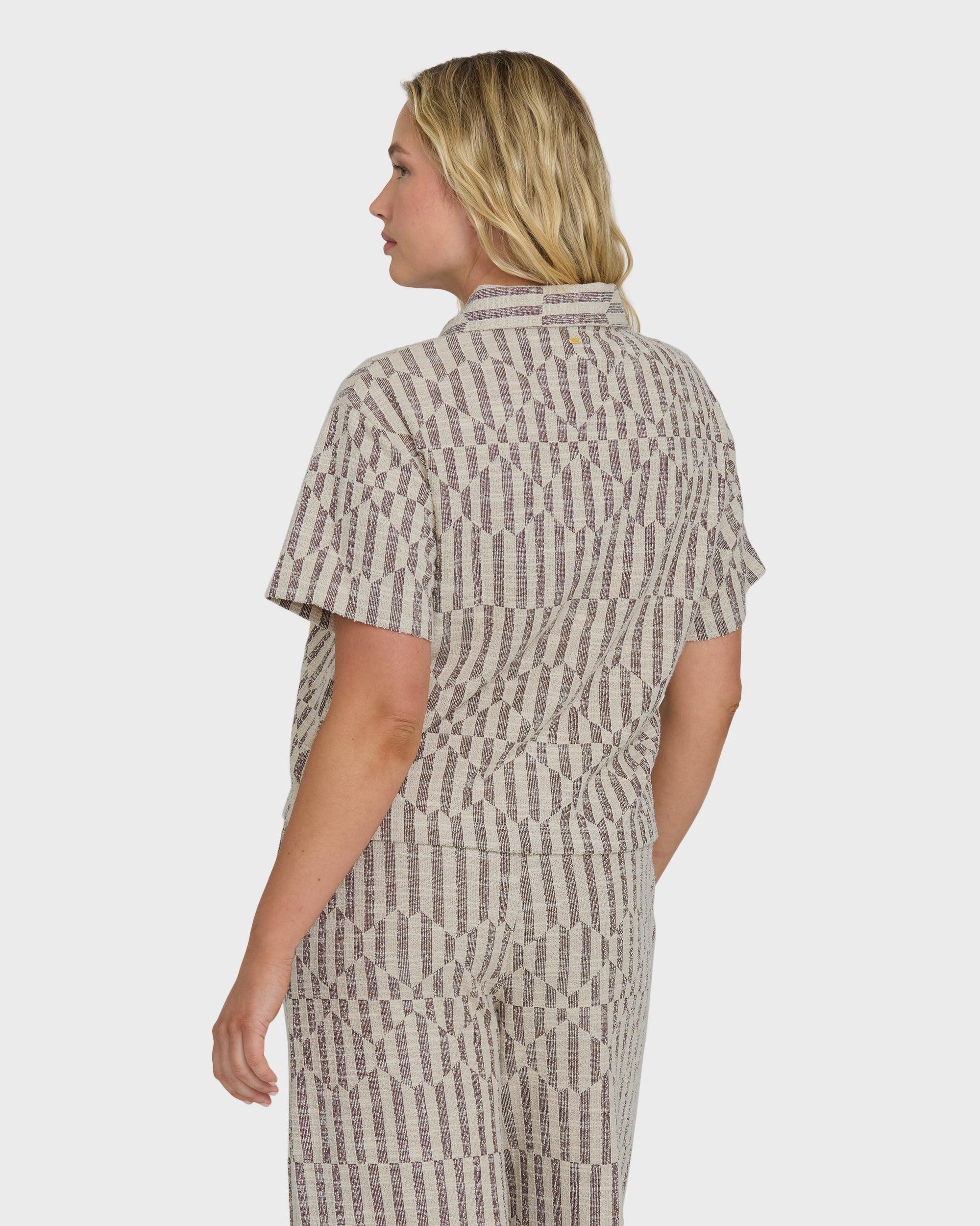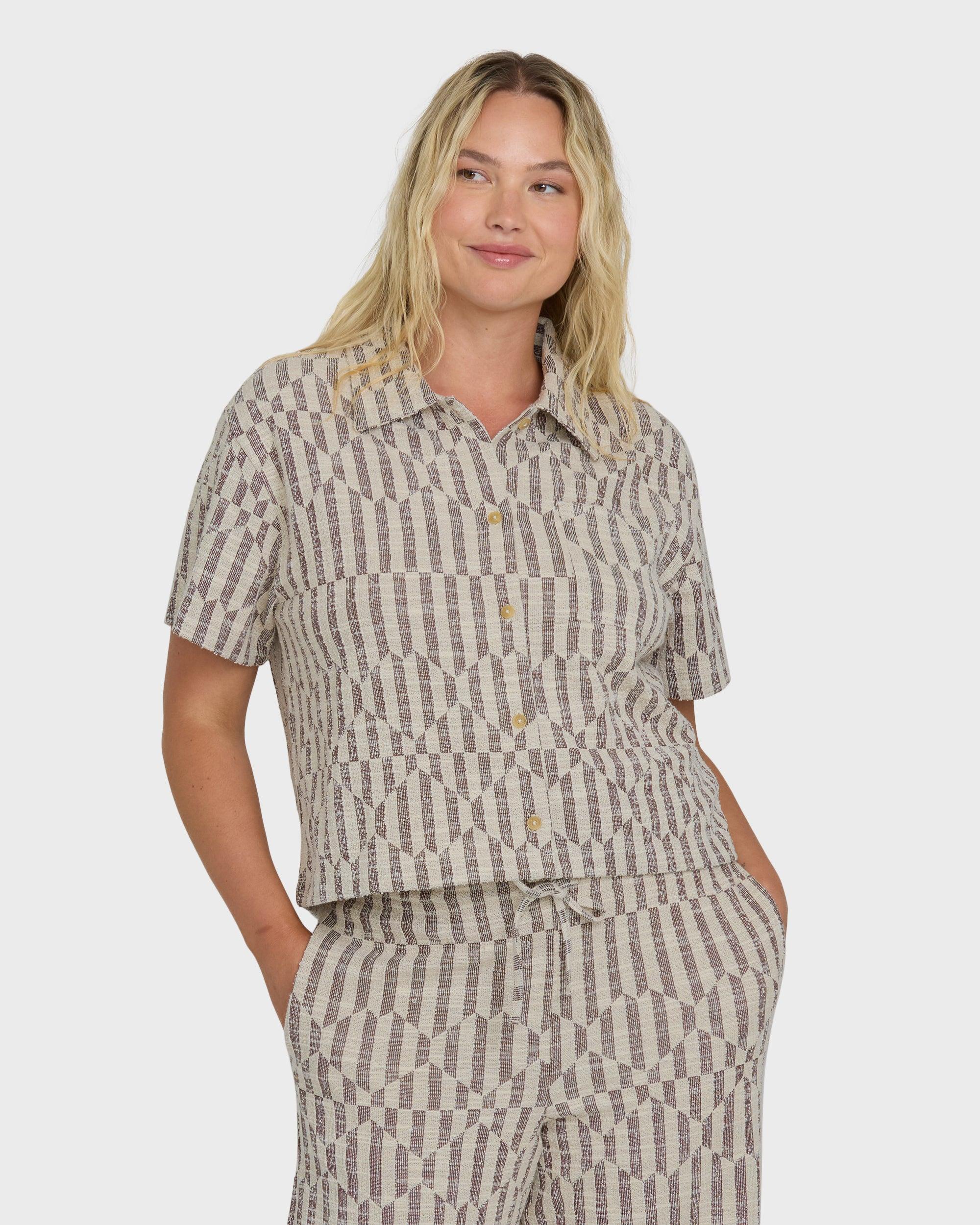 Our Vivid Wave Short Sleeve Top combines comfort with casual style. The soft cotton-polyester blend fabric feels great against your skin, while the classic button-down design with collar and convenient chest pockets keeps things practical. A subtle metal plate detail adds just the right finishing touch to this versatile wardrobe essential. Features Fabric: 60% cotton 40% polyester knit jacquard Type: Button down shirt Fit: Front button placket, collar, and chest pockets. Features: Metal plate