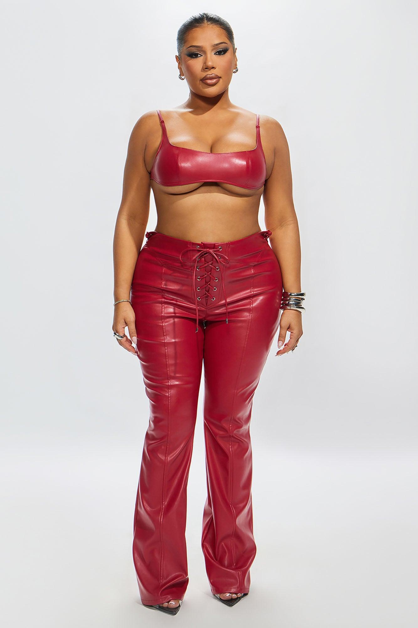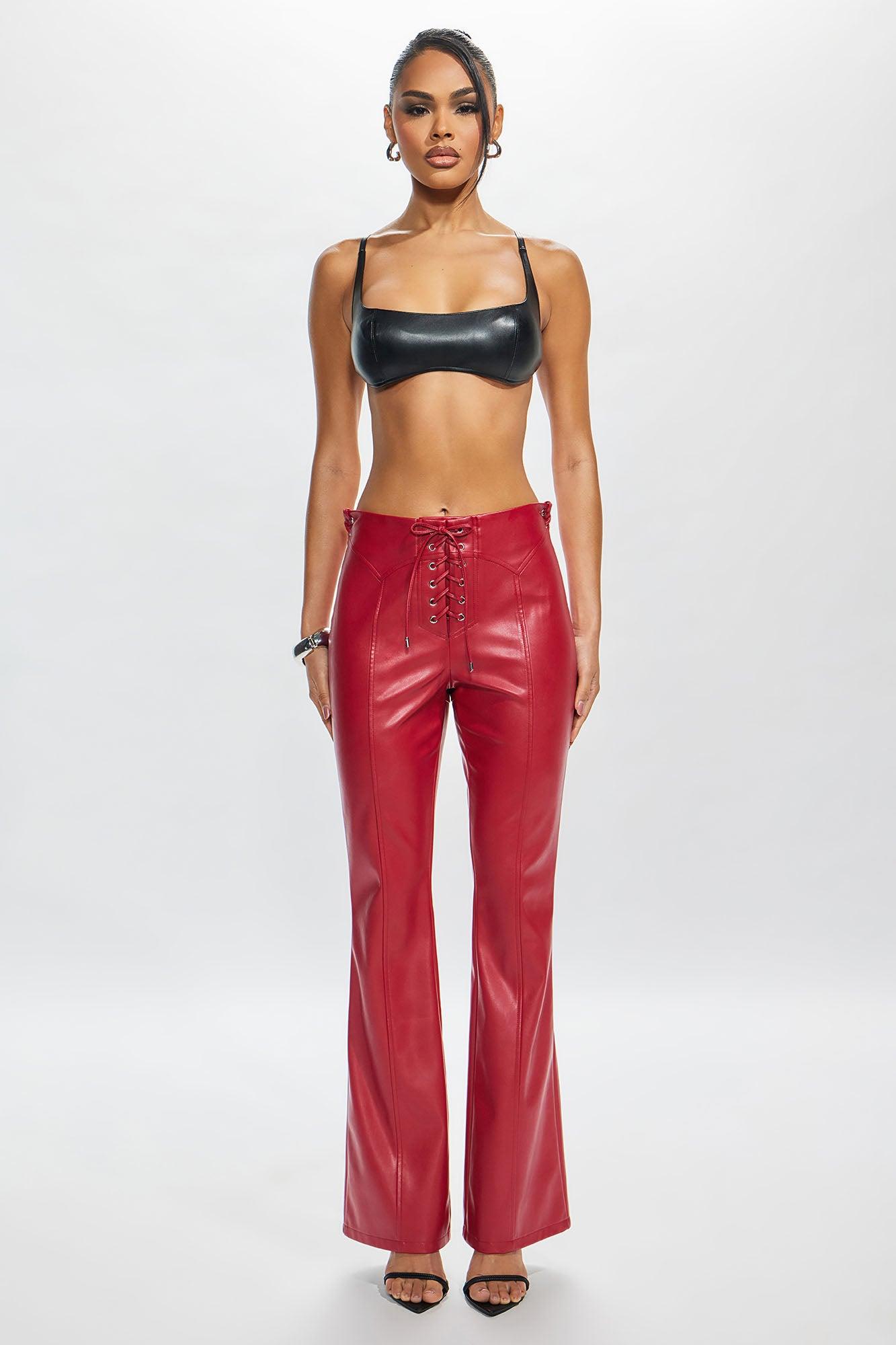 Available In Black And Red. Faux Leather Flare Pant Lace Up Detail Grommets Low Back Rise Non Stretch Shell Facing 100% Polyurethane Shell Backing 100% Polyester Imported California Proposition 65WARNING: Cancer and Reproductive Harm - www.P65Warnings.ca.gov.