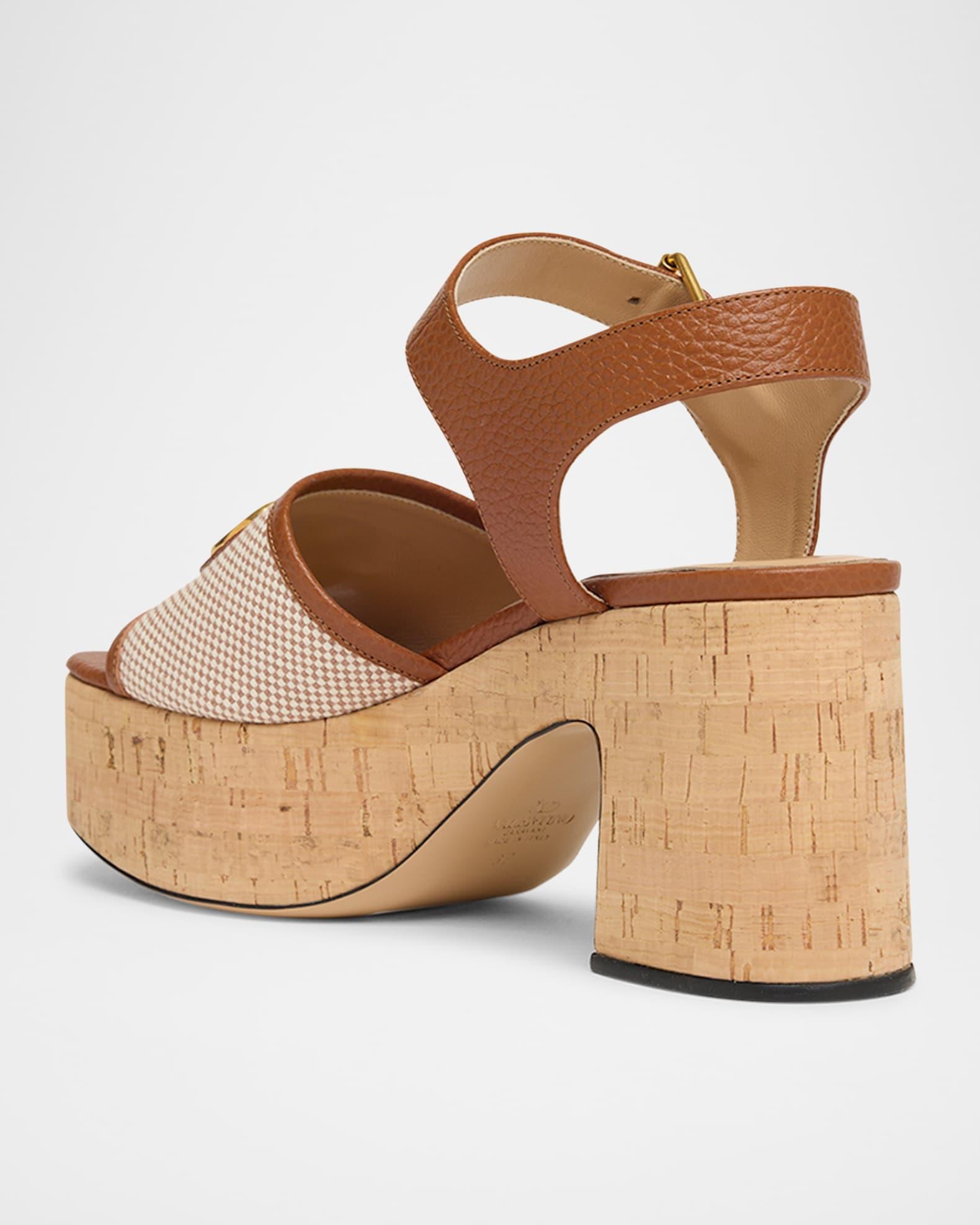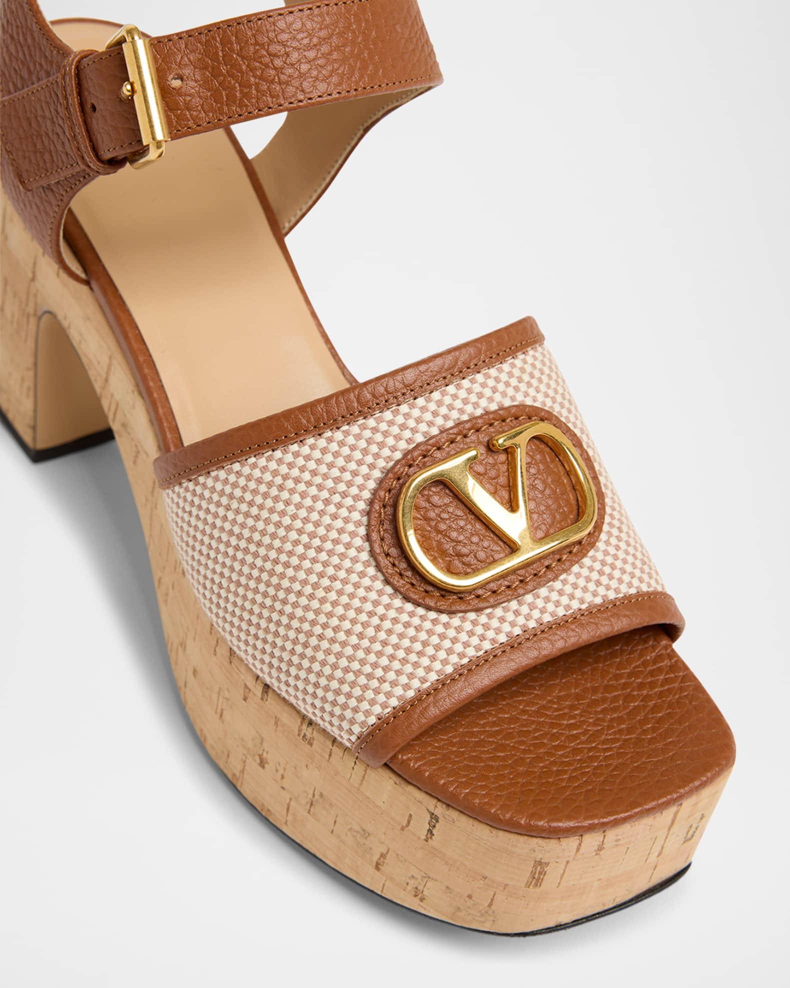 Valentino sandals in calf leather and canvas with signature VLogo accent 3.15 in / 80 mm cork block heel Square open toe Wide band upper Adjustable ankle strap Leather lining and sole Made in Italy