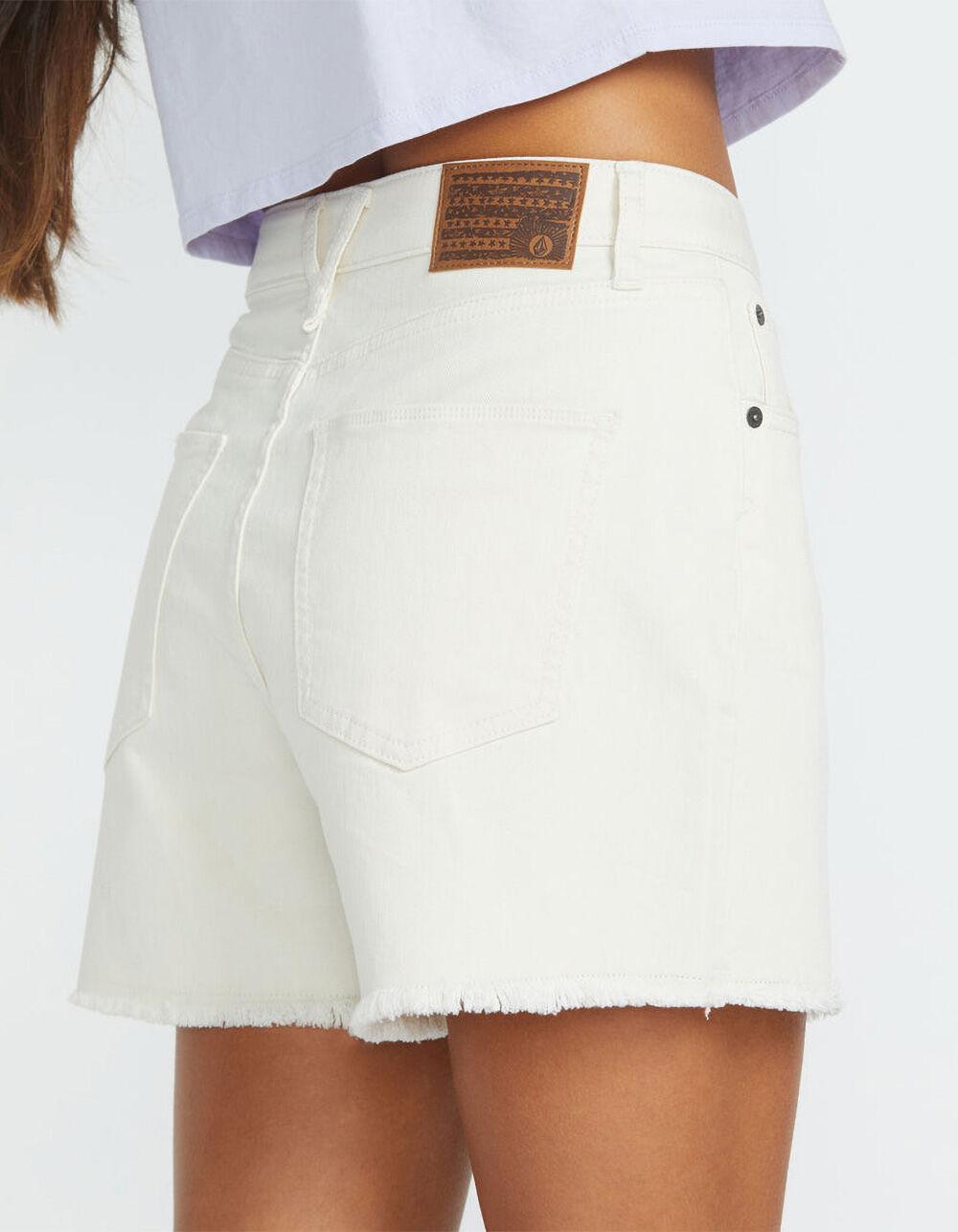 Volcom Stone Step High Rise Denim Shorts. Made from a cotton and elastane blend, the Stone Step High Rise Denim Shorts are built to stretch. Featuring a loose, boyfriend fit, these shorts are both cute and comfortable. High rise boyfriend fit shorts. Zipper fly. Volcom signature denim branding. 4" inseam. 11.5" front rise. 99% Cotton 1% Elastane. Machine wash. Imported.