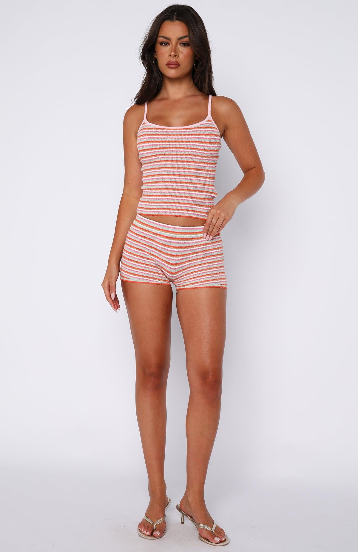 Island attire perfected. The Volume Maxed Knit Top in otton Candy Stripe features thin adjustable shoulder straps, a flattering scoop neckline, and a fitted silhouette in soft knit with a bold stripe pattern. Pair with the matching Volume Maxed Knit Booty Shorts, sandals, and sunnies for a chic, sun-soaked look.
